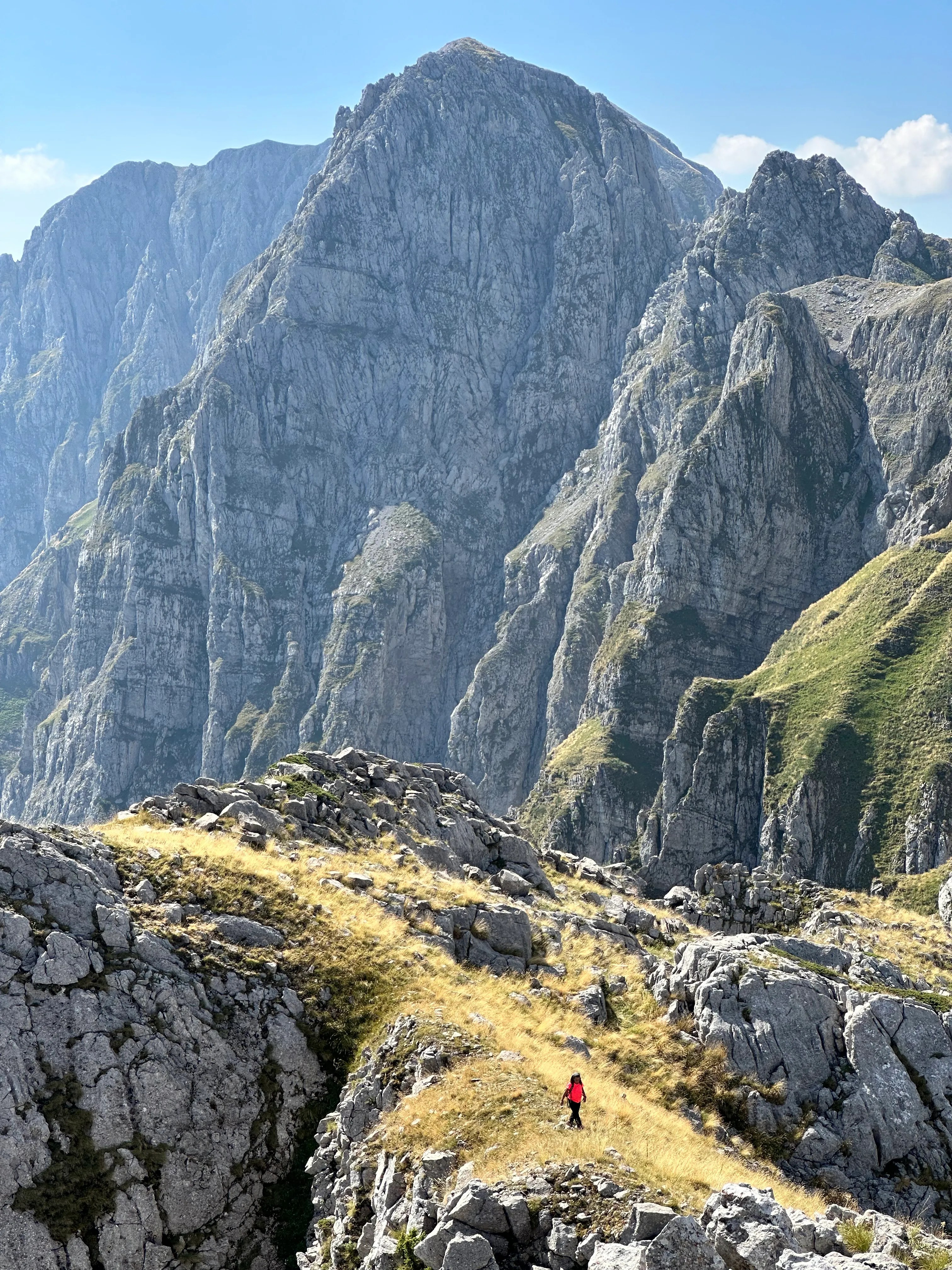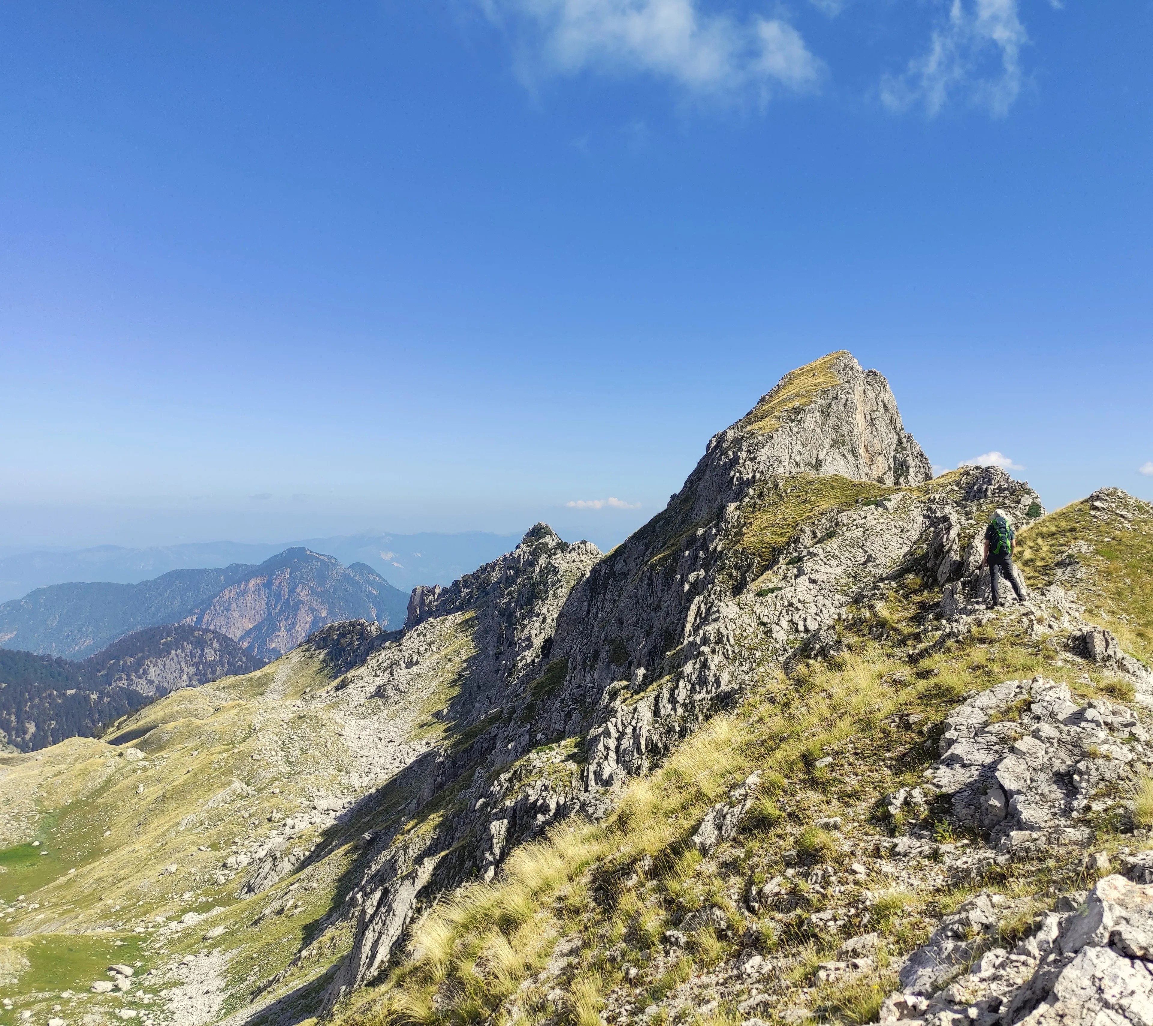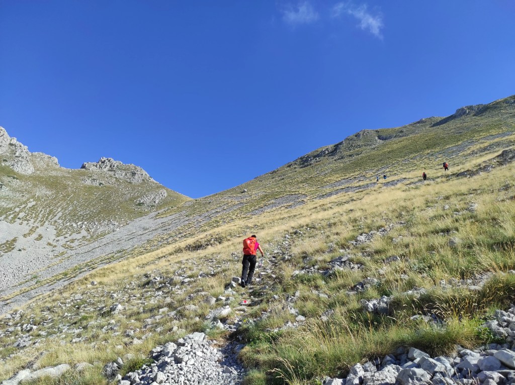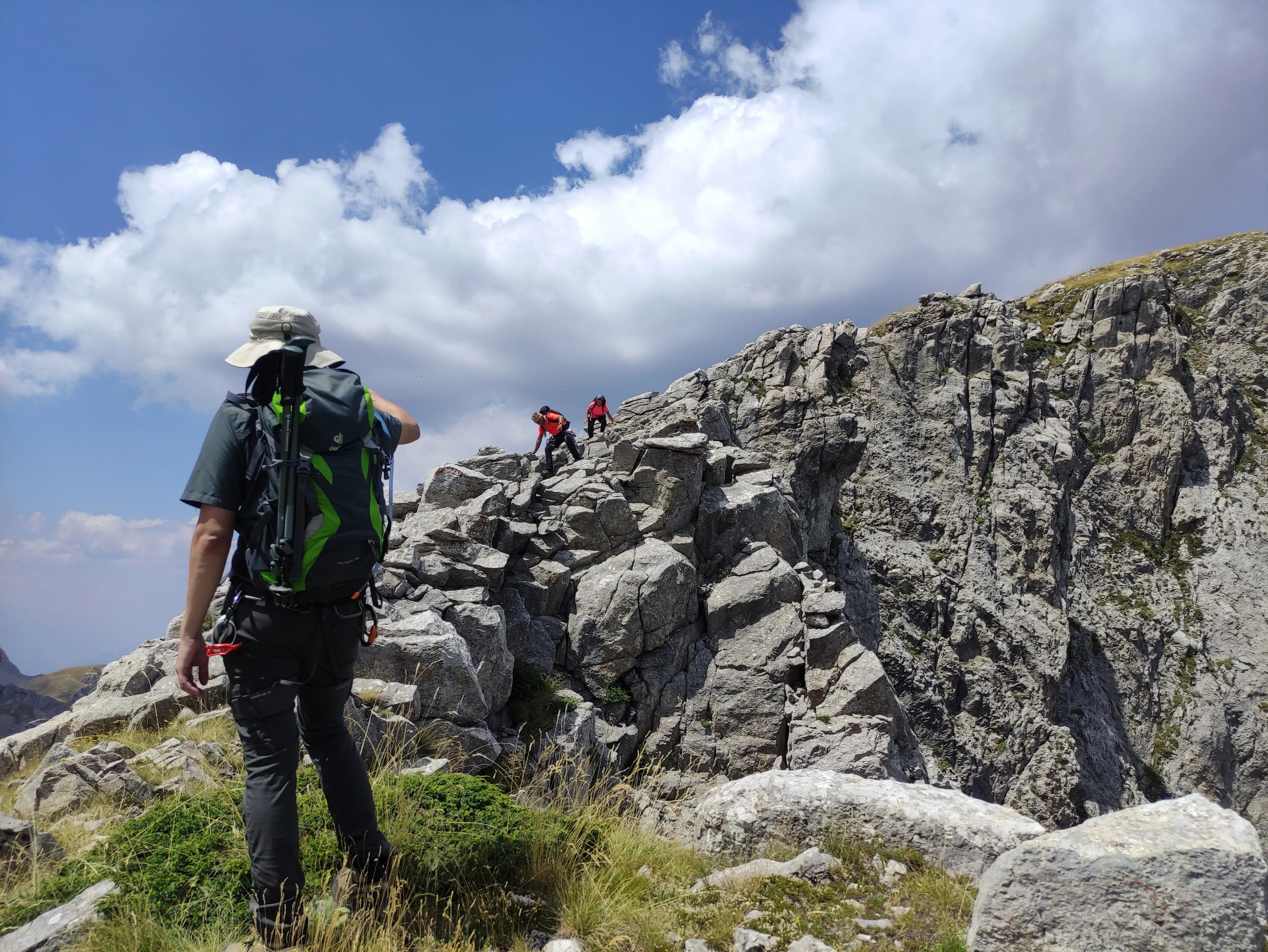 Από εκεί, ακολουθήσαμε για λίγο το μονοπάτι που κατηφορίζει προς τη λάκκα, αλλά το αφήσαμε νωρίς και ψηλά, περίπου στο [39.97052, 20.85277] και κατόπιν κινηθήκαμε δεξιά, προκειμένου να ακολουθήσουμε την προφανή πεταλόσχημη ράχη που οδηγεί στην προκορφή της Τσούκα Ρόσσα. Ήδη, από τις φωτογραφίες και τη μακροσκοπική άποψη της προκορφής, καταφέραμε να εντοπίσουμε τα σημεία εκείνα που βγάζουν κάποια τεχνική δυσκολία πριν τη μικρή τελική κόντρα πάνω στο γρασίδι. Αρχικά υπάρχει ένα κομμάτι scrambling UIAA I πάνω σε μεγάλα, μη εκτεθειμένα βράχια (όπου περισσότερο θέλει προσοχή, μην γυρίσει κανένα πόδι) και έπειτα δύο εκτεθειμένα μικρά περάσματα μέχρι UIAA II, σε μορφή τραβέρσας, όπου καλούμαστε να μελετήσουμε ψύχραιμα τις επόμενες κινήσεις μας, τα πατήματα και τα πιασίματά μας, τα οποία, σε κάθε περίπτωση, είναι άφθονα. Πρόκειται για ένα κομμάτι που μάλλον απαιτεί καθαρή σκέψη, προσοχή και εκτίμηση τερέν για σαθρά, παρά αναρριχητική τεχνική. Μια ενδεχόμενη πτώση σε συγκεκριμένα σημεία θα μπορούσε πολύ εύκολα να αποβεί μοιραία και τούτο σίγουρα δύναται να θέσει τον οποιονδήποτε στον φαύλο κύκλο του πανικού.