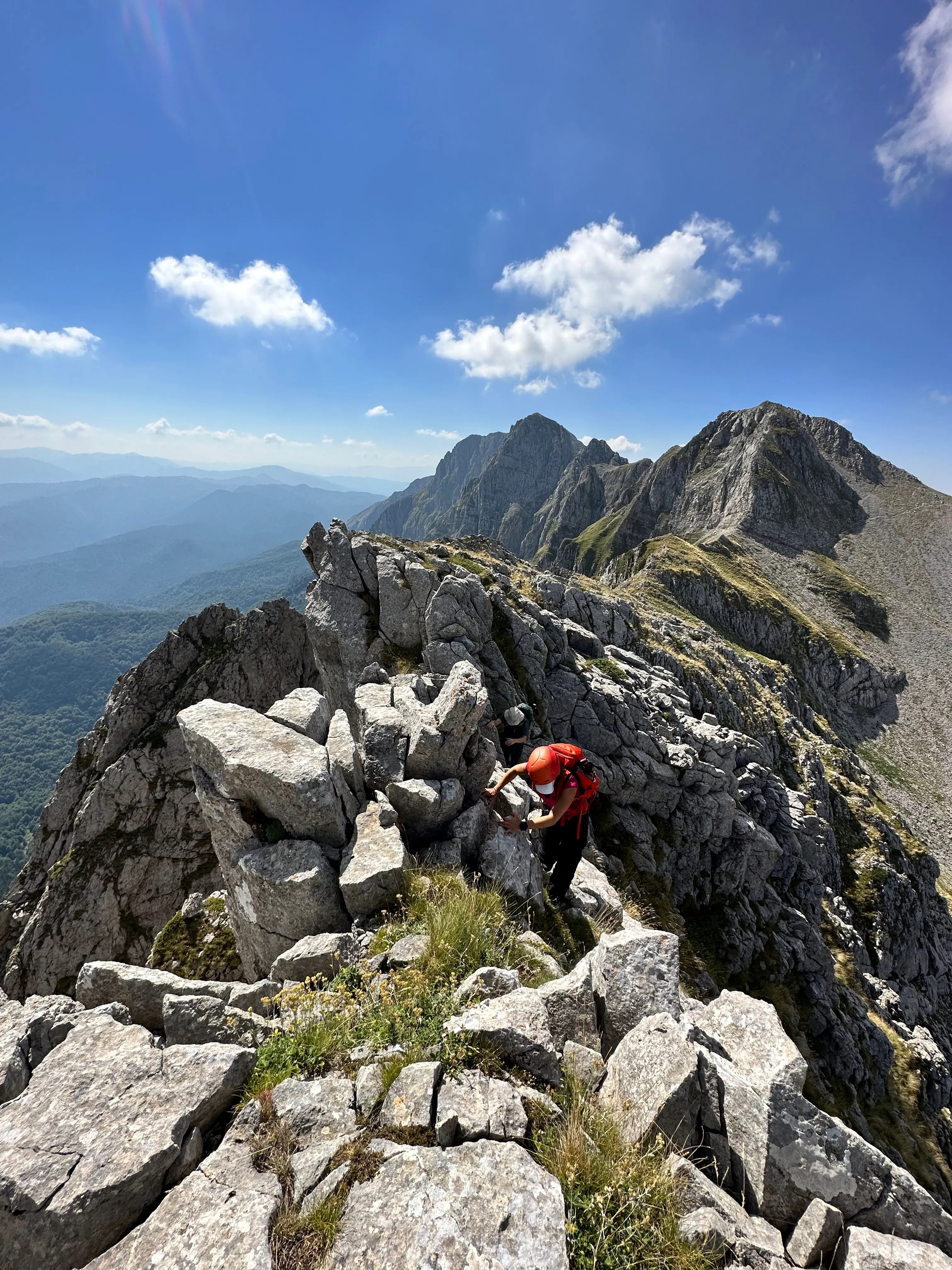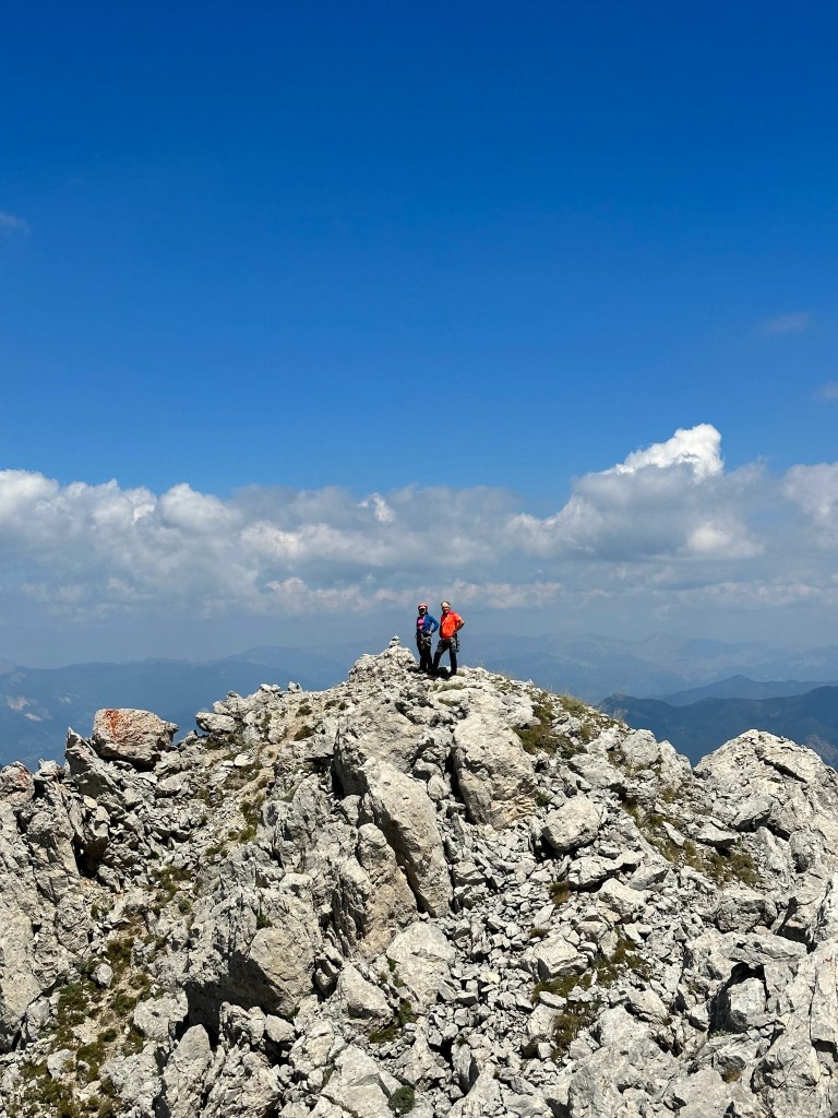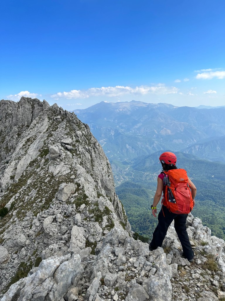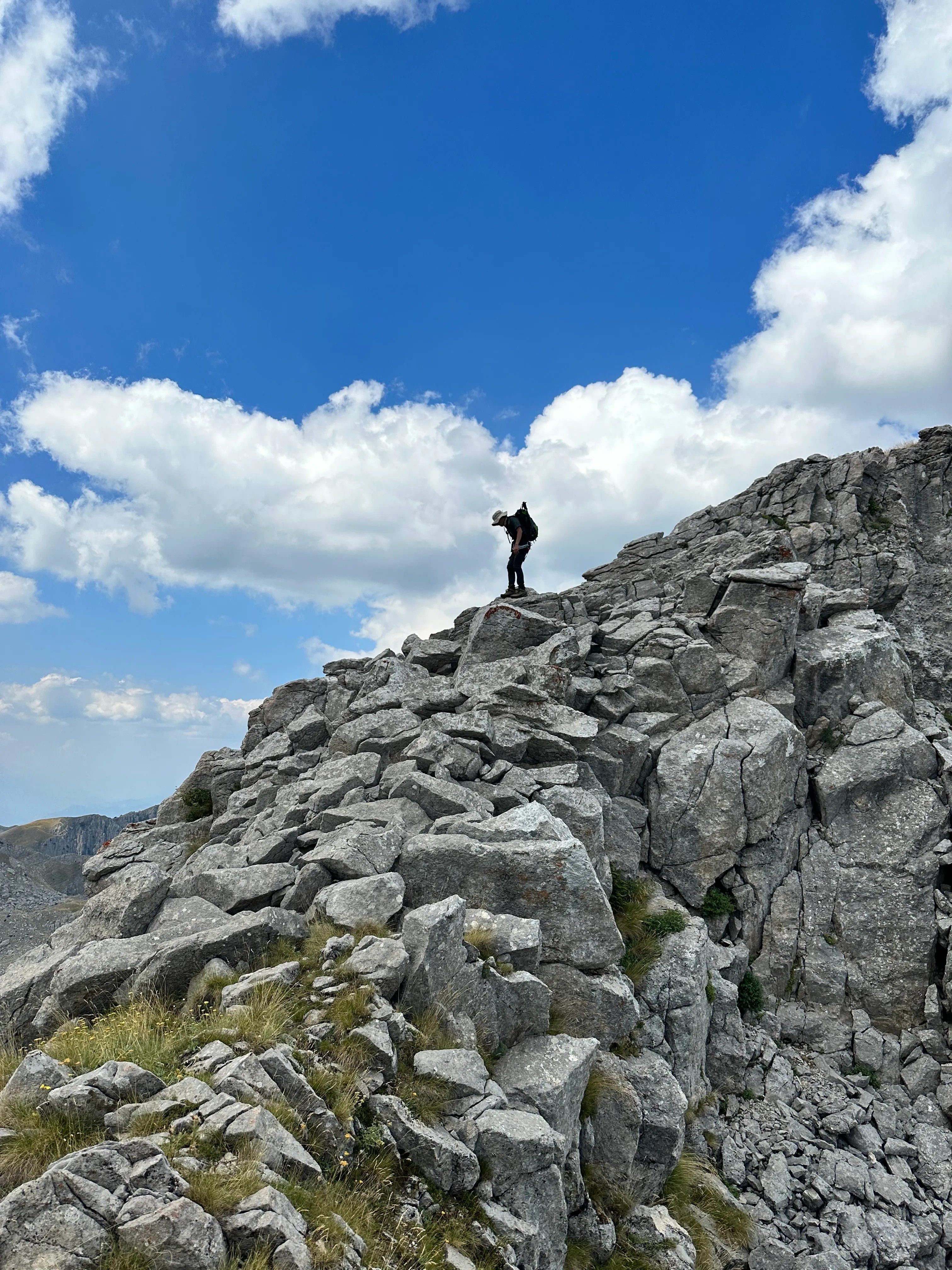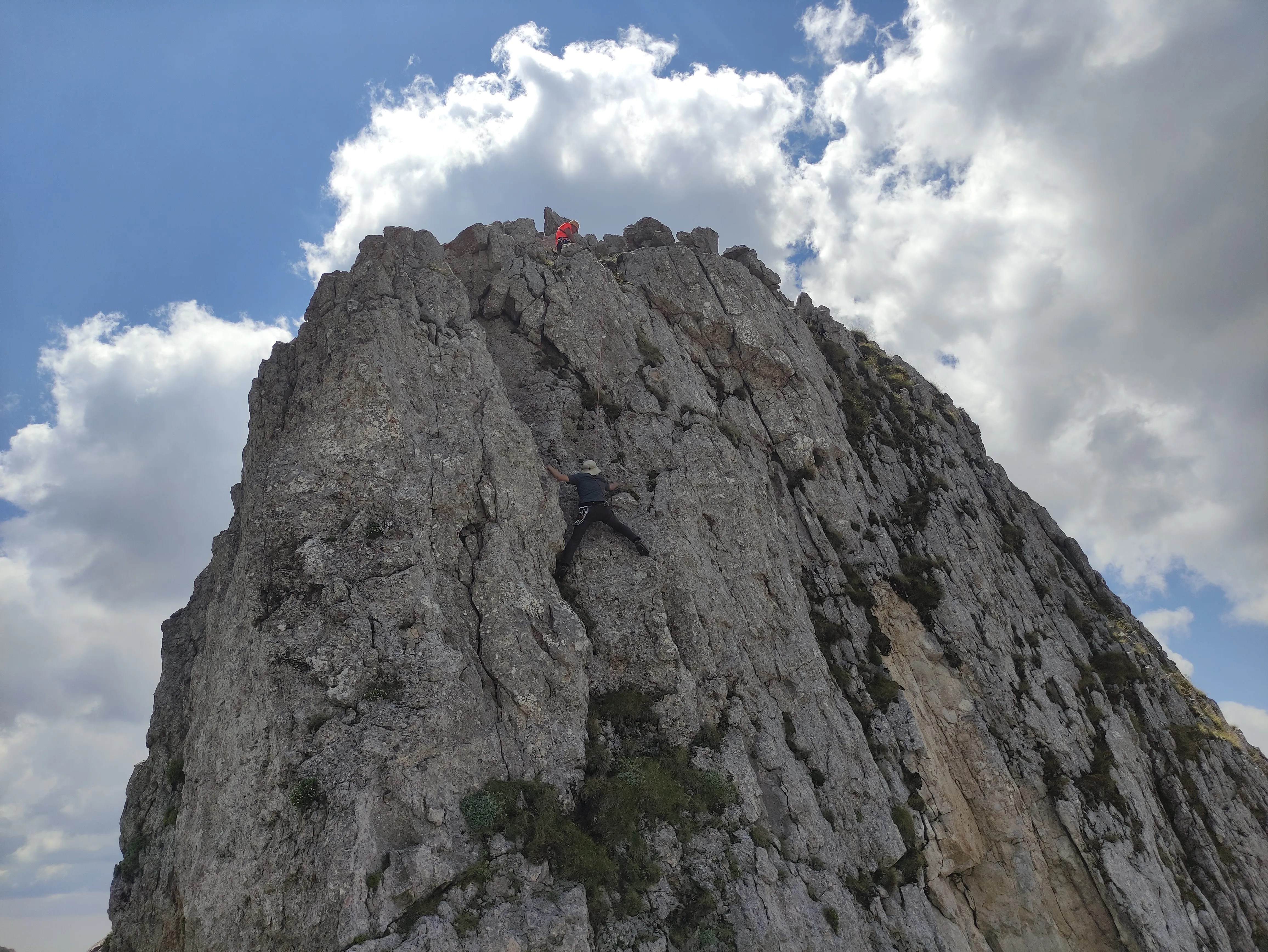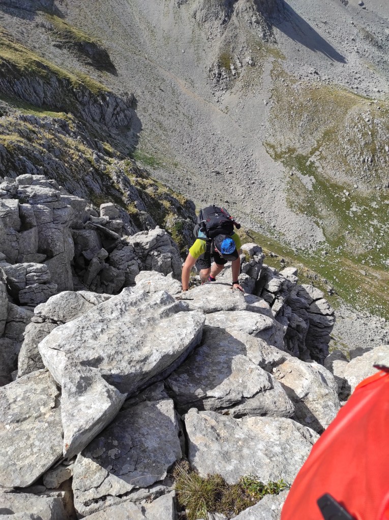To επόμενο ανηφορικό κομμάτι, τα τελευταία 50 μέτρα πριν την κύρια κορυφή, εκτυλίσσεται αρχικά σε σαθρή πεζοπορική κόντρα, κατόπιν σε μικρή κεκλιμένη και ημιεκτεθειμένη πλάκα 3-4 μέτρων και κατόπιν πάνω στη βράχινη αλληλουχία μιας κόψης, η οποία απαιτεί scrambling επιπέδου UIAA I–II, που σε διάφορα σημεία δεν συγχωρεί στραβοπάτημα και –όπως και τα προηγούμενα περάσματα– απαιτεί ιδιαίτερη προσοχή για τυχόν σαθρά πατήματα/πιασίματα. Το πιο εντυπωσιακό με το εν λόγω κομμάτι είναι ότι –μακροσκοπικά από την προκορφή– φάνταζε δύσκολο, απειλητικό και αδιαπέραστο και, περιμένοντας τη σειρά μου για το ραπέλ, ατένιζα τη συνέχεια με δέος και απαισιοδοξία. Τελικά, για καλή μας τύχη, το βουνό είχε τον τρόπο του να μας υποδεχθεί στην κορυφή του, προσφέροντάς μας την πολυπόθητη δίοδο βήμα-βήμα.