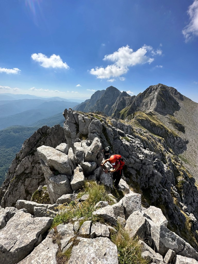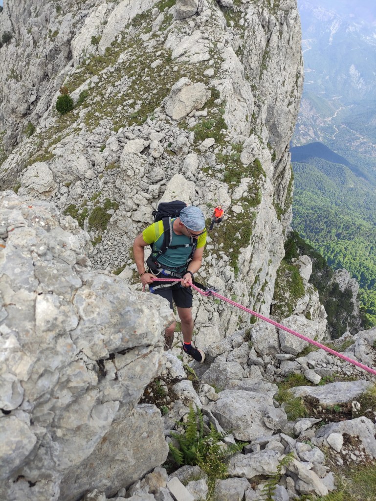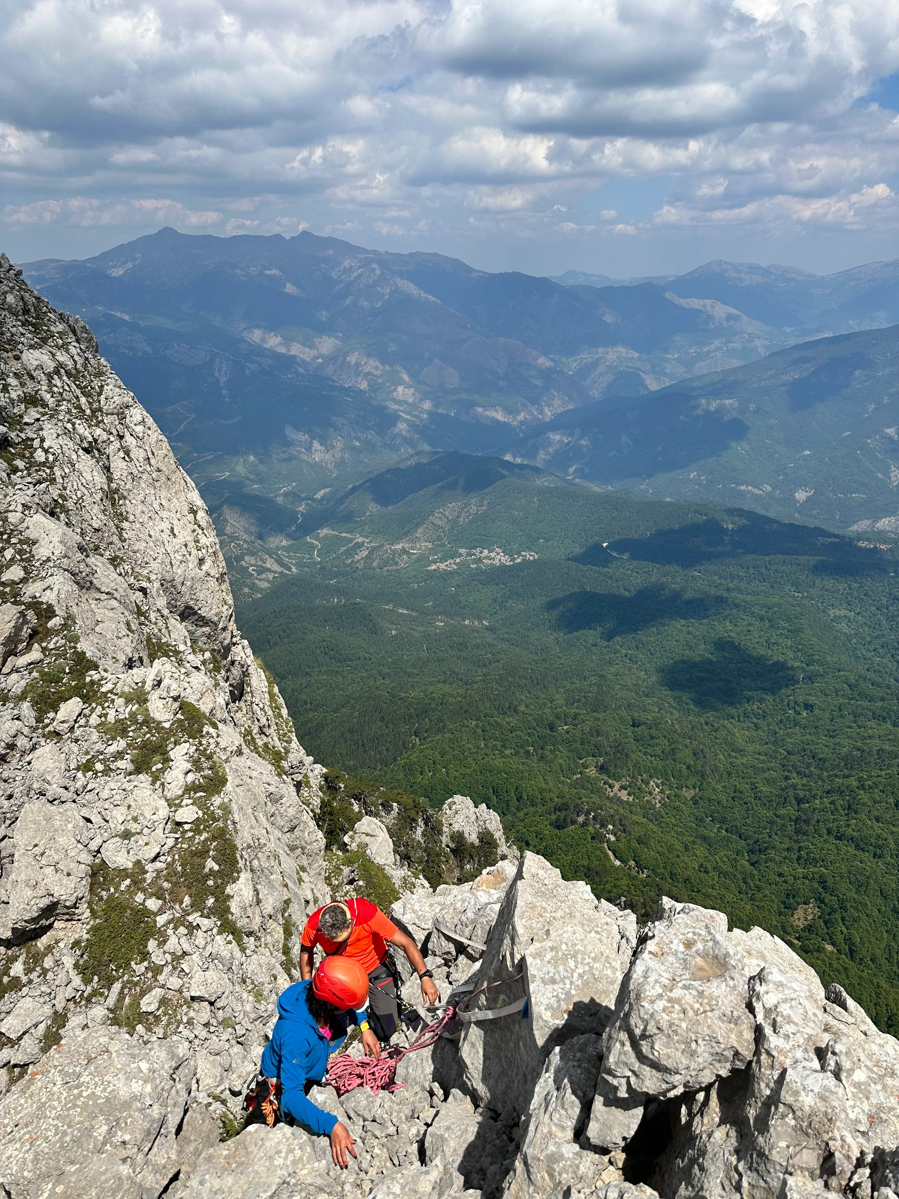 Ακολουθεί μικρή πεζοπορική κόντρα ως την προκορφή. Από εκεί, πλέον, είμαστε σε θέση να ατενίσουμε, μερικές δεκάδες μέτρα πιο μακριά, την πραγματική κορυφή της Τσούκα Ρόσσα, η οποία διαφαίνεται ως ένα μικρό «δόντι» που εξέχει στα χτένια της κορυφογραμμής. Σαν τάφρο που την προστατεύει από εχθρικά πόδια, μπροστά μας έχουμε κάθετο γκρεμό περίπου 17 μέτρων, ο οποίος καταλήγει σε μικρό διάσελο/έξοδο λουκιού, όπου θα κατέβουμε με ραπέλ. Την περίοδο της ανάβασής μας υπήρχαν ήδη περασμένοι από τα ντουβάρια της προκορφής τρεις μεγάλοι λευκοί ιμάντες σε καλή κατάσταση, τους οποίους και χρησιμοποιήσαμε για το ρελέ του ραπέλ, μαζί με δικούς μας για backup, φυσικά. Χρησιμοποιήθηκε, επίσης, σχοινί 60 μέτρων και φυσικά όλα τα παραφερνάλια του ραπέλ, η περιγραφή και χρήση των οποίων δεν εντάσσεται στο πλαίσιο της παρούσας δημοσίευσης. Ατάκτως ερριμμένες τριγύρω από το ρελέ υπάρχουν πέτρες όλων των μεγεθών, που πιθανώς να καταλήξουν στο κεφάλι κάποιου αναρριχητή, είτε κατά το ραπέλ είτε κατά την ανάβαση της επιστροφής και χρειάζονται τεράστια προσοχή, ιδίως από τα μέλη της ομάδας που παραμένουν στην προκορφή, σε αναμονή του ραπέλ των προηγούμενων σχοινοσυντρόφων τους. Γλιστρώντας στα σχοινιά του ραπέλ, παίρνει κανείς μια πρόγευση της αναρρίχησης που θα κληθεί να κάνει κατά την επιστροφή, η οποία φαντάζει πιο τρομακτική από ό,τι είναι στην πράξη. Αυτονοήτως, αφού όλοι είχαμε κατέβει πια στο διάσελο, το σχοινί του ραπέλ παρέμεινε κρεμασμένο, ώστε μας επέτρεψε να σκαρφαλώσουμε τον ίδιο βράχο του ραπέλ με το σχοινί από πάνω (top rope).