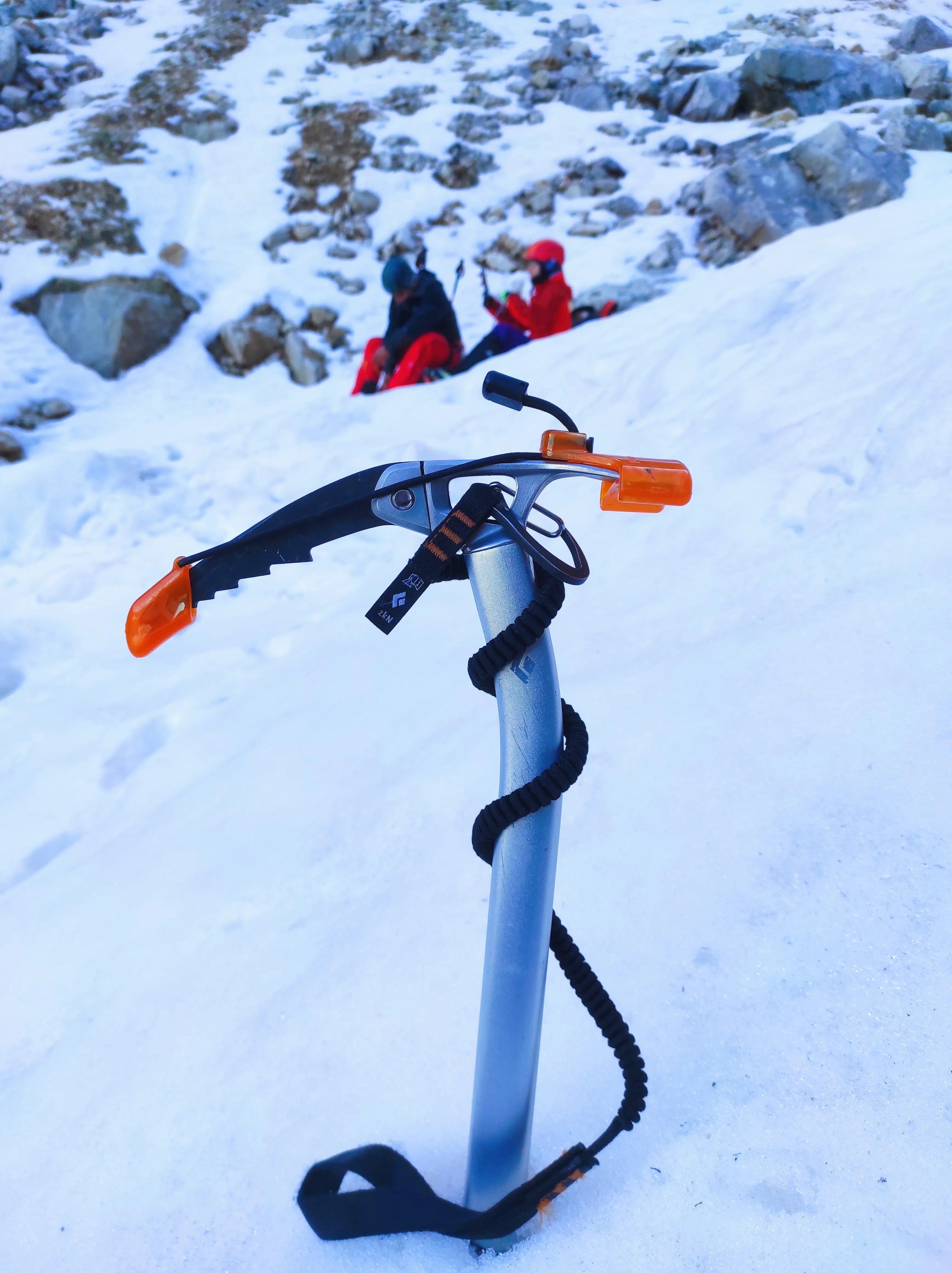 Υψώνοντας το βλέμμα, διακρίναμε ευθεία επάνω, στο «snowfield», μια συστάδα βράχων να στραφταλίζουν στη λιακάδα που έλουζε πλέον την κορυφογραμμή. Ο πρωινός παγετός έλιωνε και οι συνθήκες γίνονταν ασταθέστερες. Τα -μέχρι πρότινος πακτωμένα- σαθρά πετραδάκια έσπαγαν τα δεσμά του πρωινού πάγου και ξεχύνονταν ελεύθερα στη βουνοπλαγιά. Μερικά από αυτά αποφάσισαν να μας προϋπαντήσουν και κατρακύλησαν μέχρι την τράχηλο, τεστάροντας την τύχη μας, το κράνος μου και το πάνω μέρος του χεριού τής Τζο, που αποκόμισε επαξίως το παράσημο της ανάβασης. Κατόπιν αυτού, αποφασίσαμε να ανοίξουμε βήμα και να σπεύσουμε προς την έξοδο της τραχήλου, όπου πλέον νιώθαμε κομματάκι εγκλωβισμένοι.