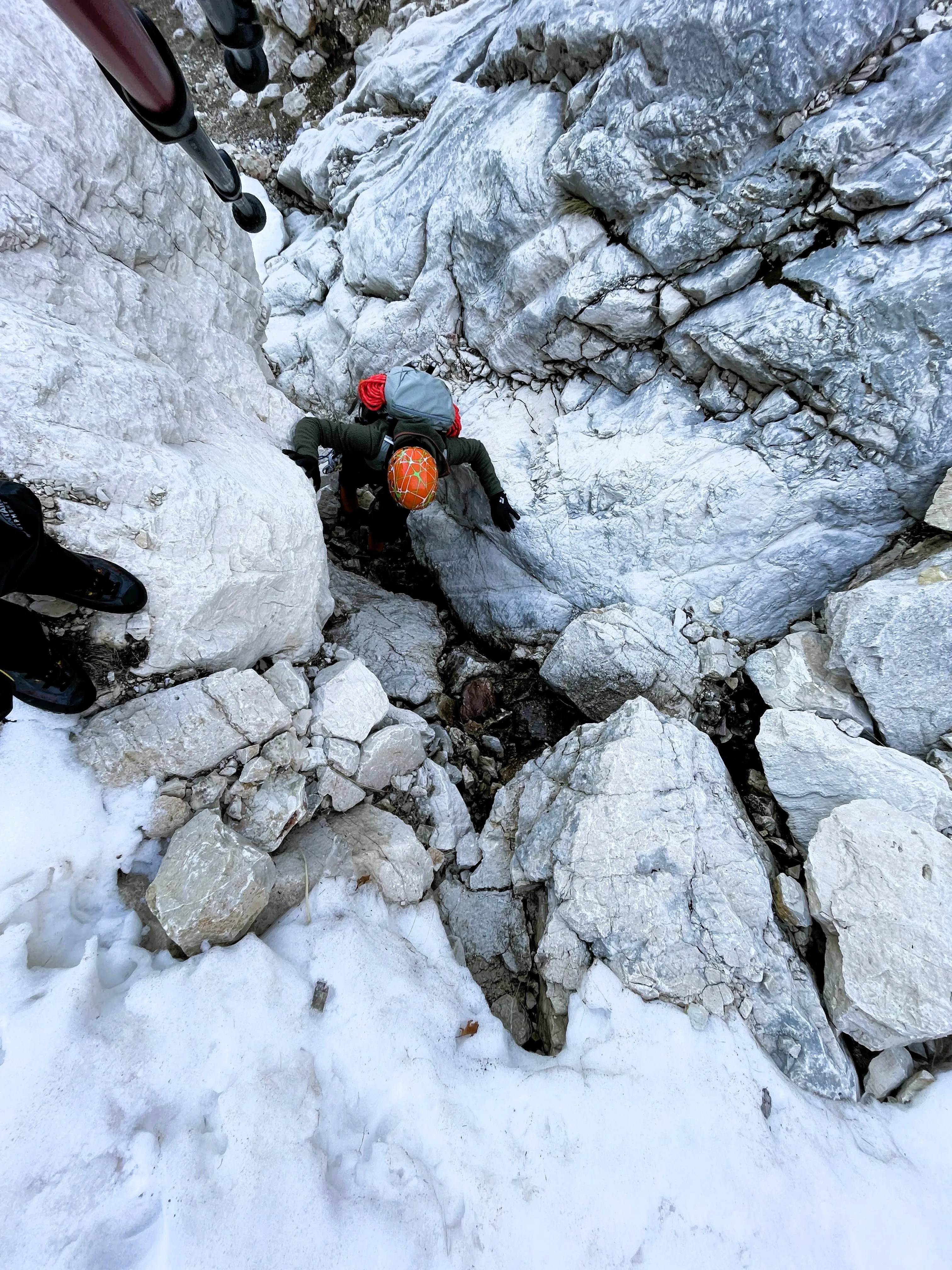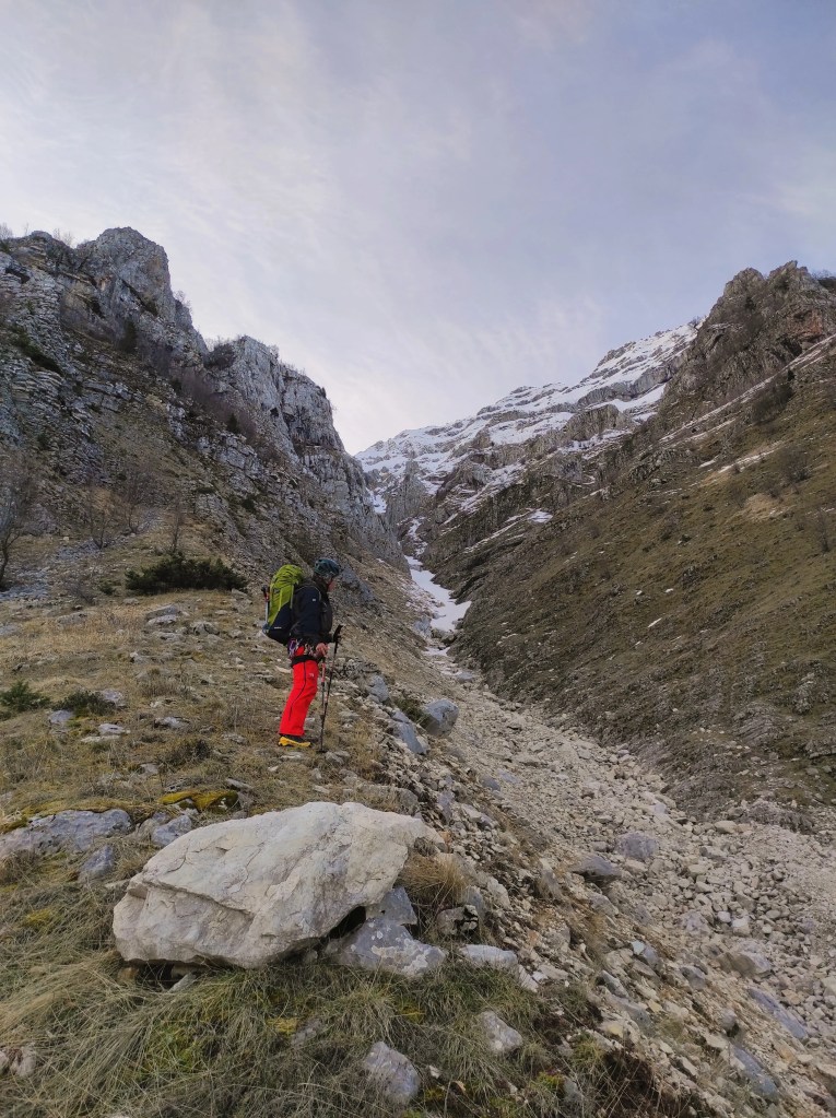 Μισή ώρα αργότερα, βρεθήκαμε στη βάση μιας άγριας, ξέχιονης σάρας, που μας καλωσόριζε στην, υπό στενή έννοια, έναρξη της διαδρομής. Υπό συνθήκες βαρύτερου χειμώνα, στη θέση της θα υπήρχε ένας ομαλός χιονισμένος διάδρομος και δεν θα χρειαζόταν να χοροπηδάμε βράχο-βράχο, με τεταμένη την προσοχή μη γυρίσει κανένα πόδι. Δεν θα είχε χρειαστεί, επίσης, να εκτελέσουμε και 1-2 αναρριχητικές κινήσεις σε υγρά βράχια (M2), ακριβώς στο όριο της γλώσσας χιονιού, προκειμένου να σκαρφαλώσουμε το τελευταίο ξέχιονο boulder ύψους δύο μέτρων περίπου. Εν προκειμένω, με τα πρώτα ρυάκια να παιανίζουν την οβερτούρα της άνοιξης, τα βράχια γλιστρούσαν και δημιουργούσαν ανασφάλεια, ακόμα και σε καλά πατήματα.