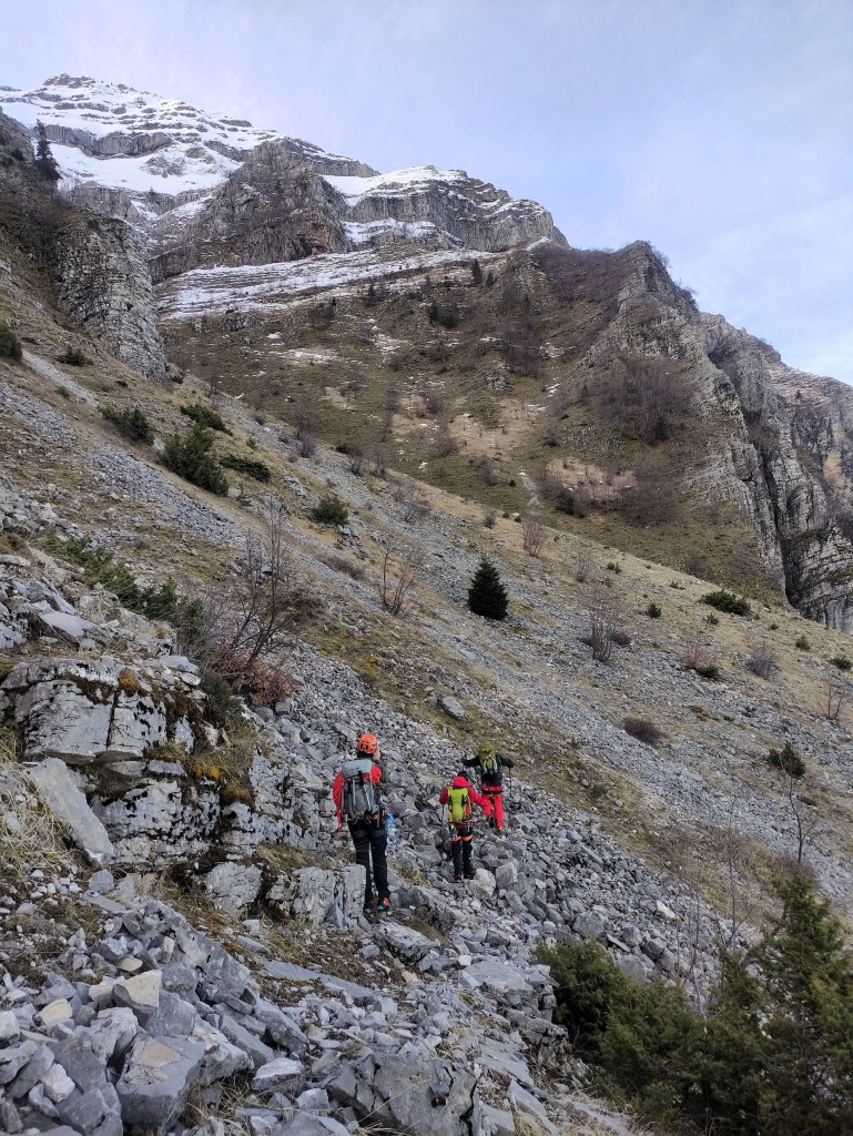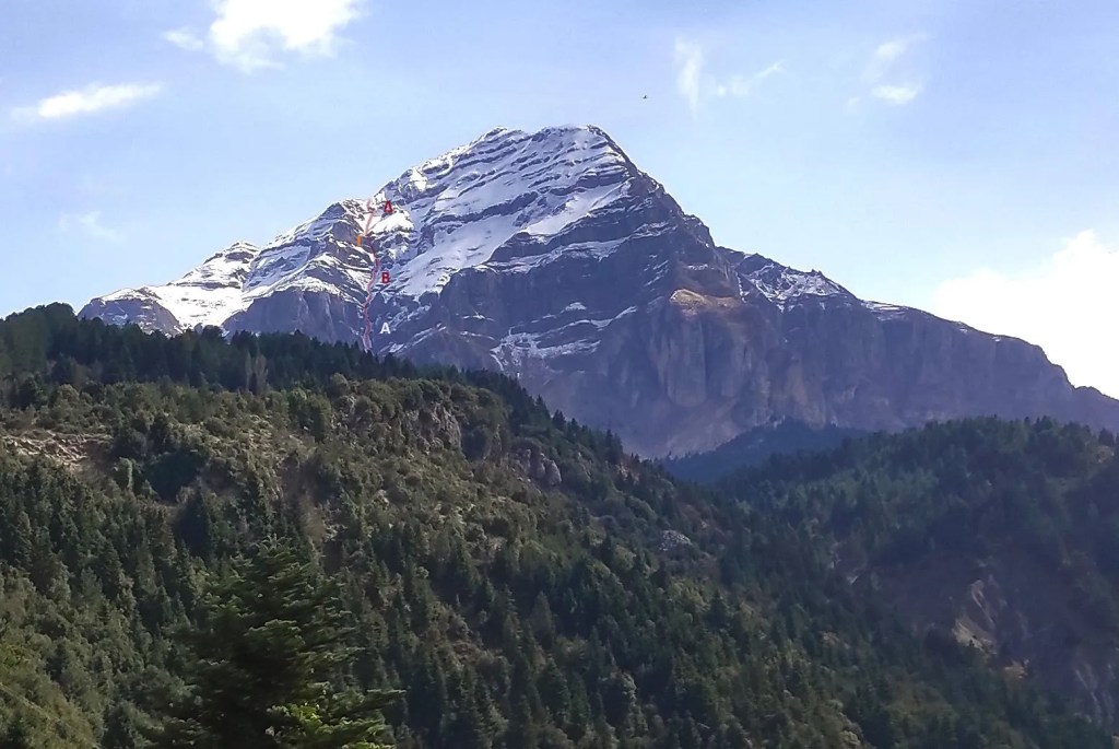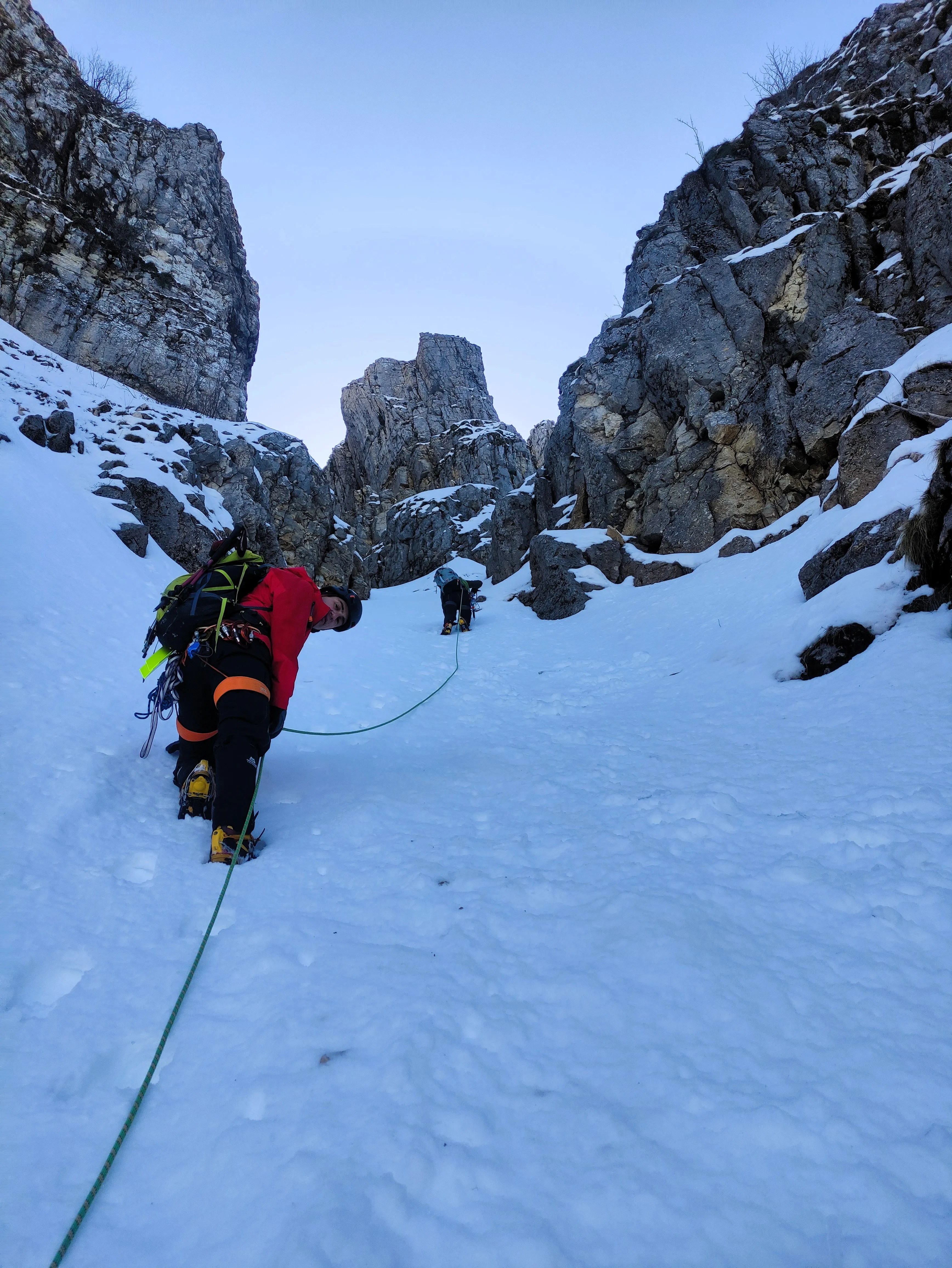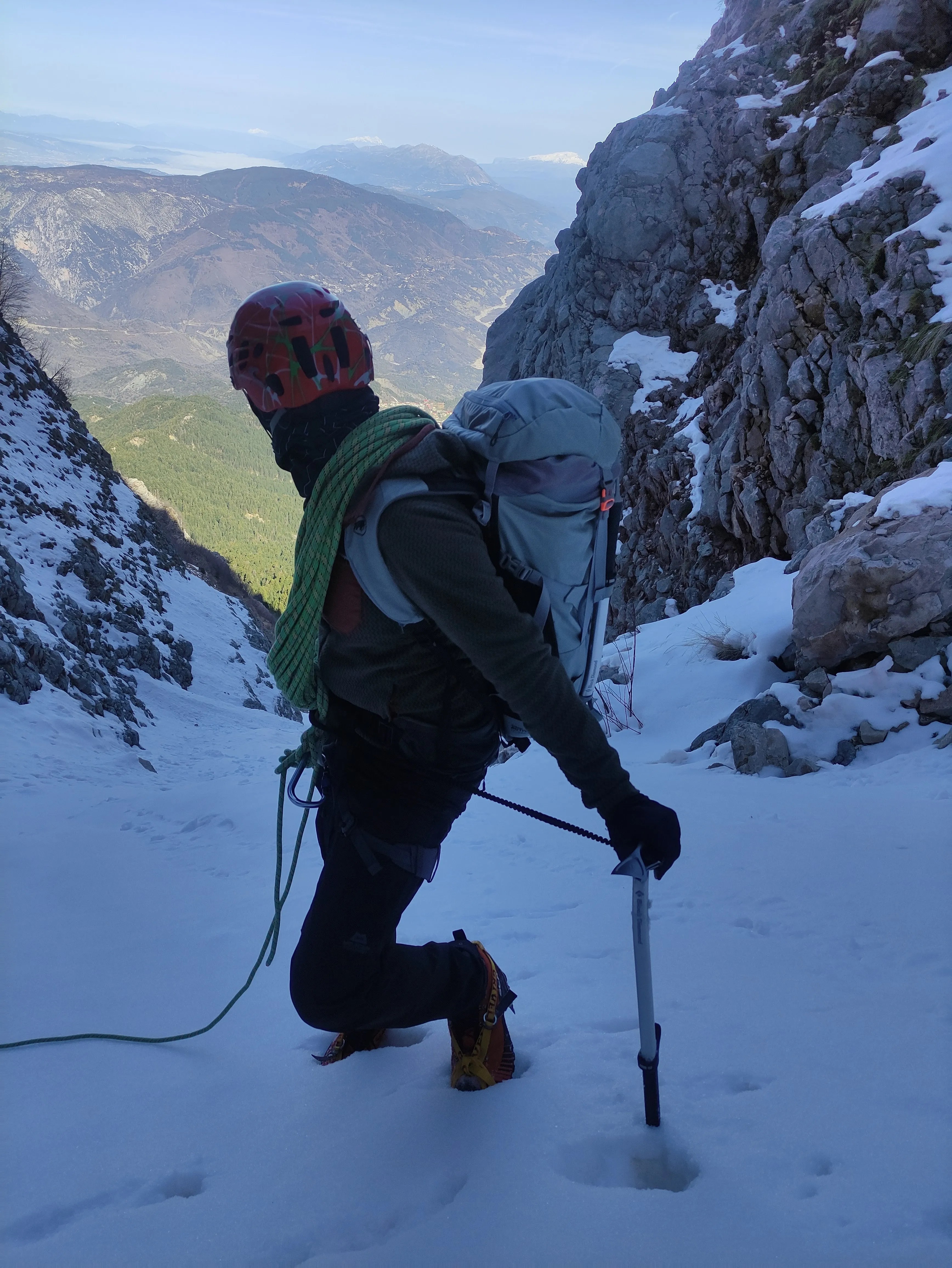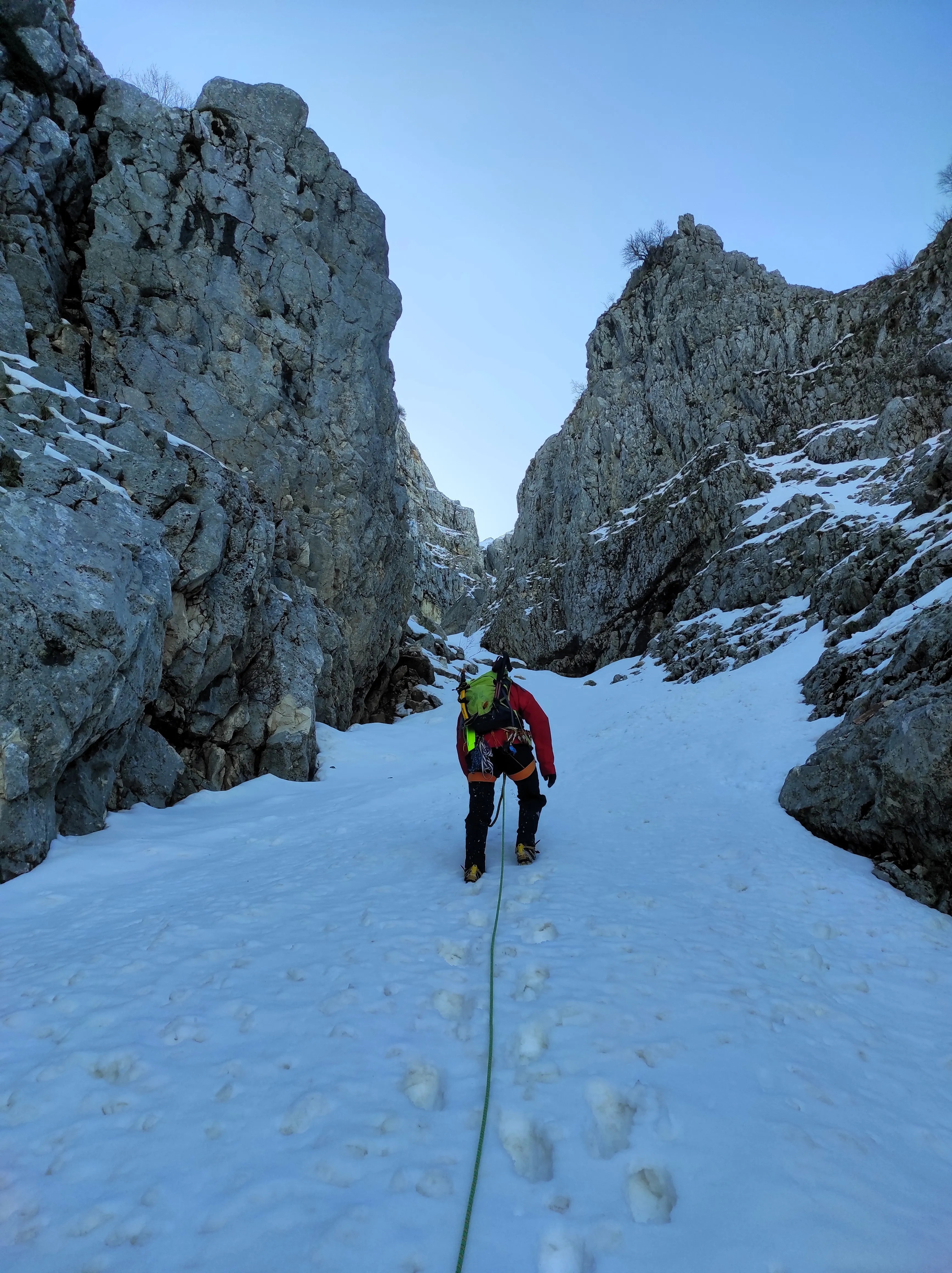 Θαρρώ πως σε κανένα σημείο η κλίση, στο εν λόγω τμήμα, δεν υπερβαίνει τις 40°. Σε κάθε περίπτωση, αισθανόμασταν άνετοι με ένα πιολέ, ενώ η ασφάλιση σε σχοινοσυντροφιά μάλλον είχε γίνει ενόψει δυσκολότερων περασμάτων ψηλότερα – όπου, ίσως, δεν θα είχαμε την ίδια ευχέρεια να κινήσουμε τις διαδικασίες δεσίματος.