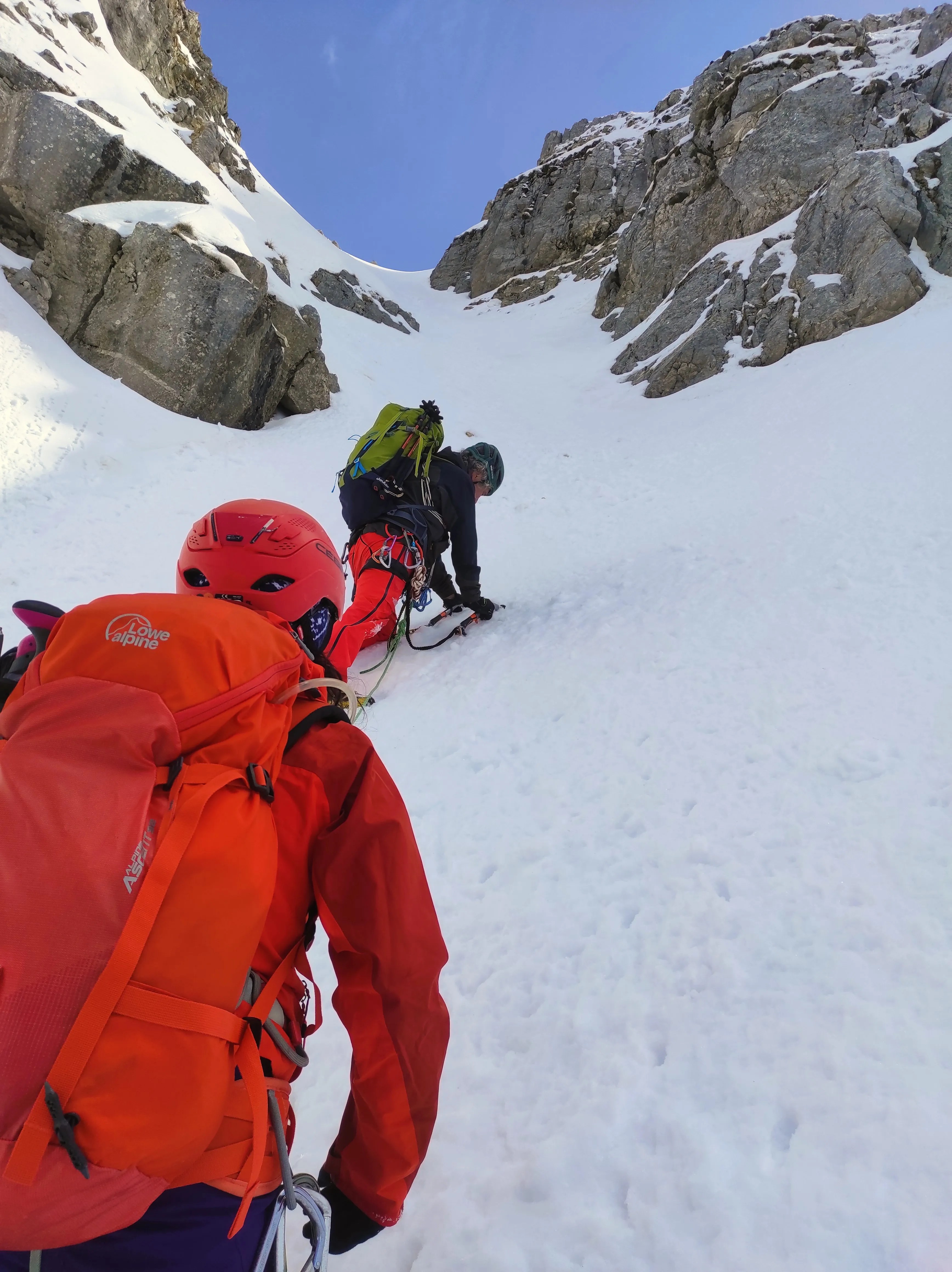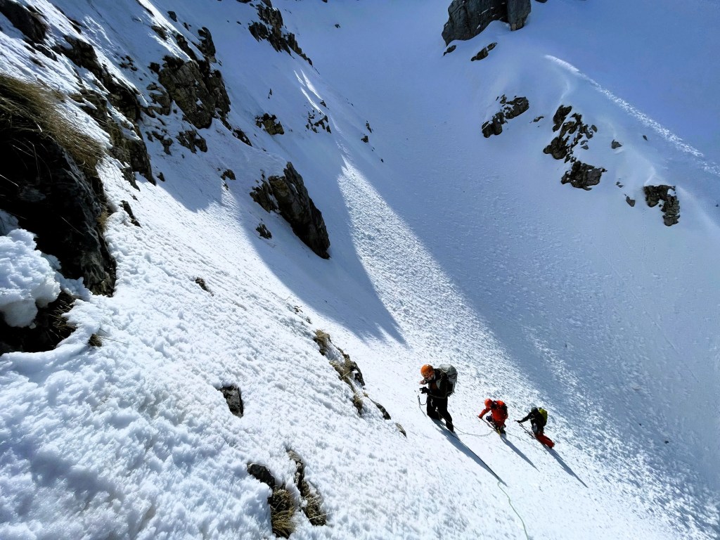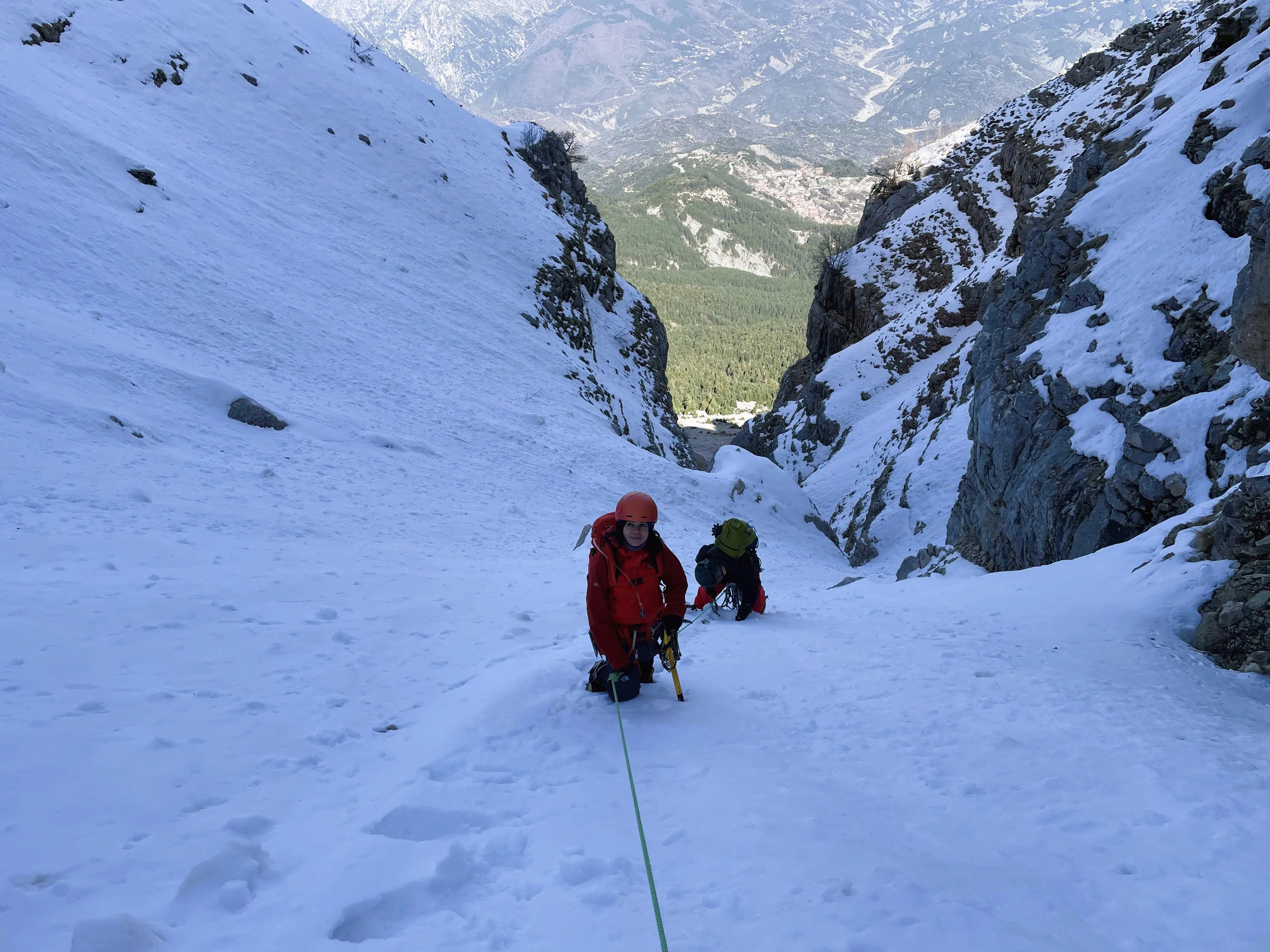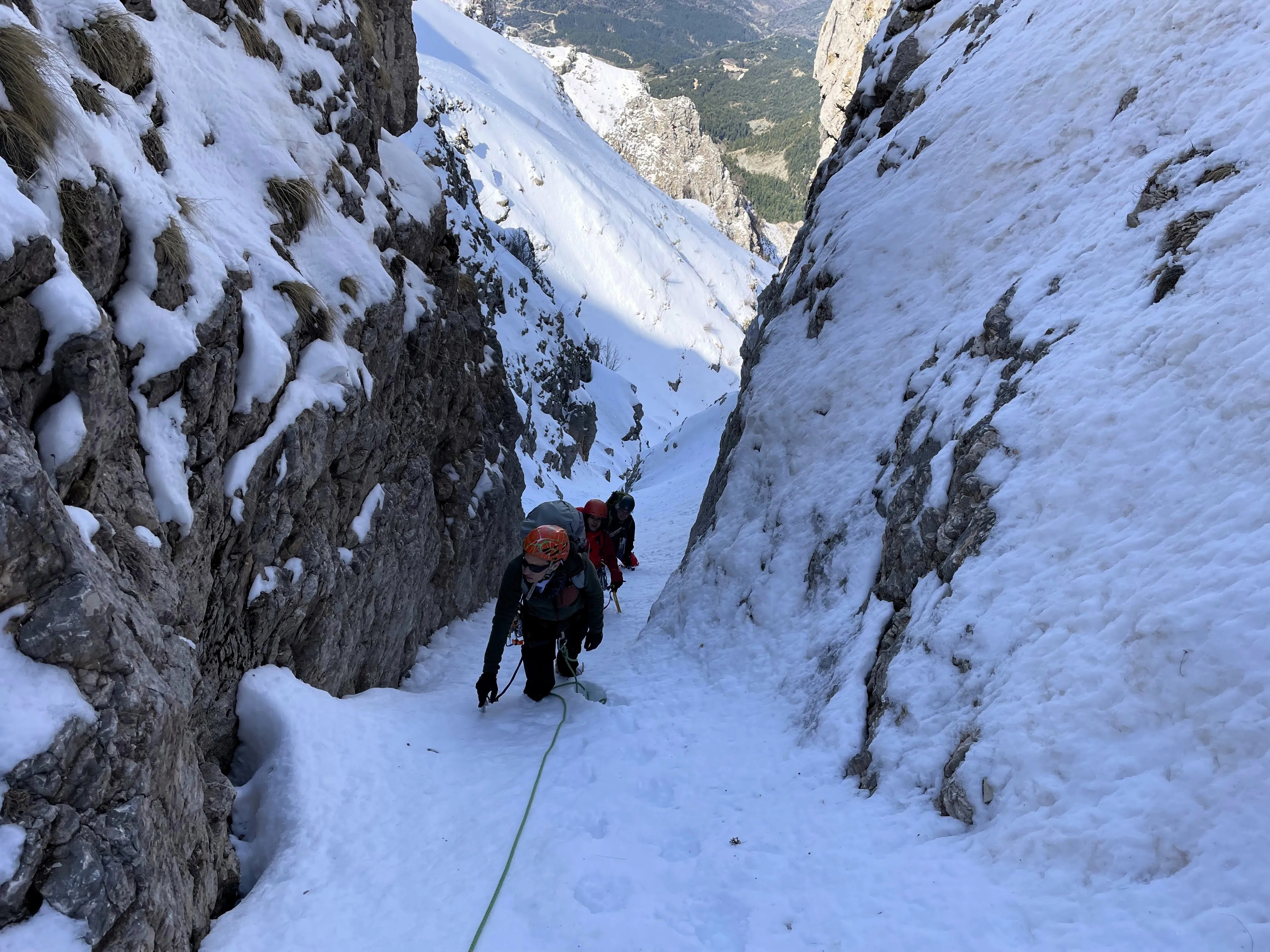 Από εκεί και πέρα, χαράξαμε μια πορεία με το σκεπτικό να παραμείνουμε στο ευνοϊκό χιόνι και να μην εκβιάσουμε μικτά, βράχινα περάσματα. Πράγματι, πίσω από χαρακτηριστικό βράχινο τείχος το κόψαμε πάλι αριστερά, μαιανδρικά κινούμενοι μέχρι την τελική ευθεία. Ως εκ τούτου, δεν κληθήκαμε να αντιμετωπίσαμε μικτά περάσματα Μ2, τα οποία αναφέρονται σε άλλες πηγές, αλλά κινηθήκαμε σε εξαιρετικά απότομο τμήμα 60°, στο πέρας της διαδρομής.