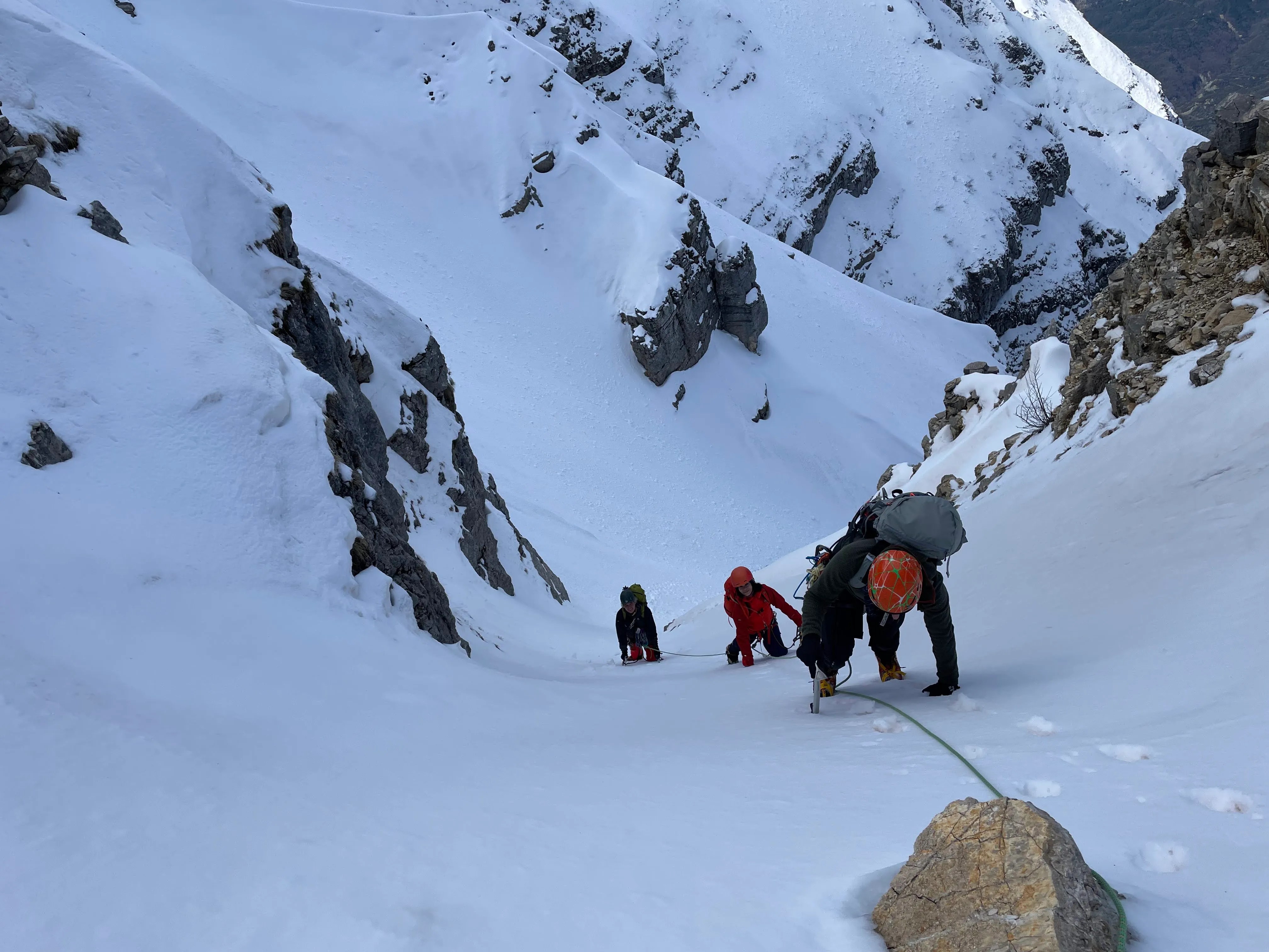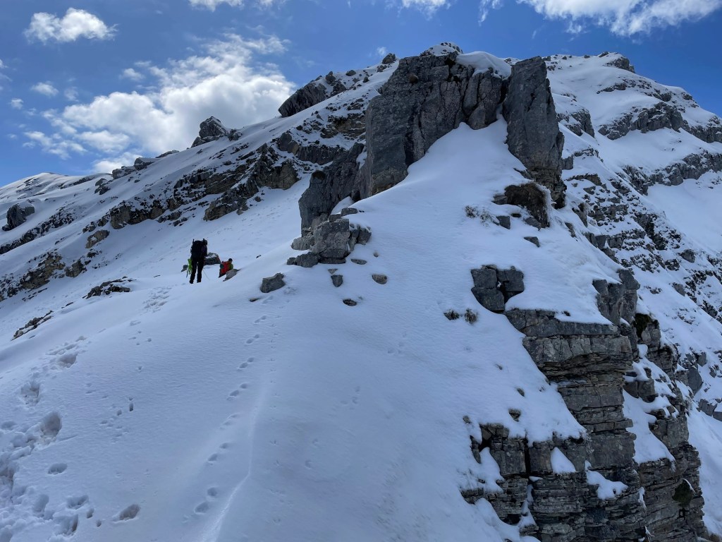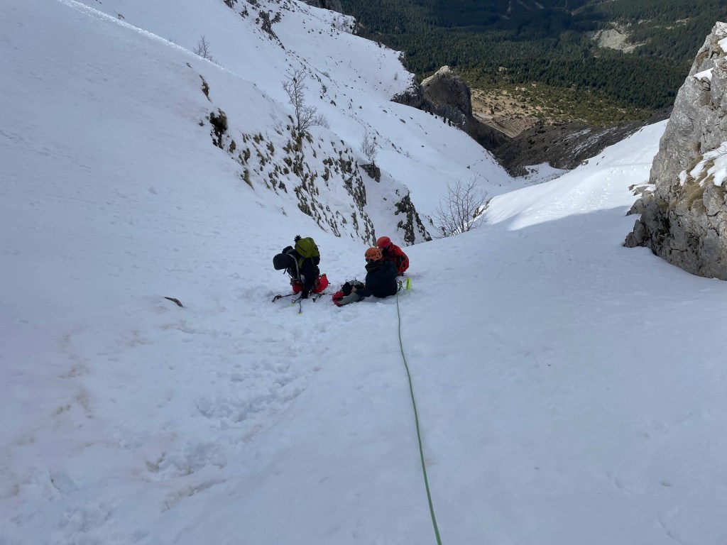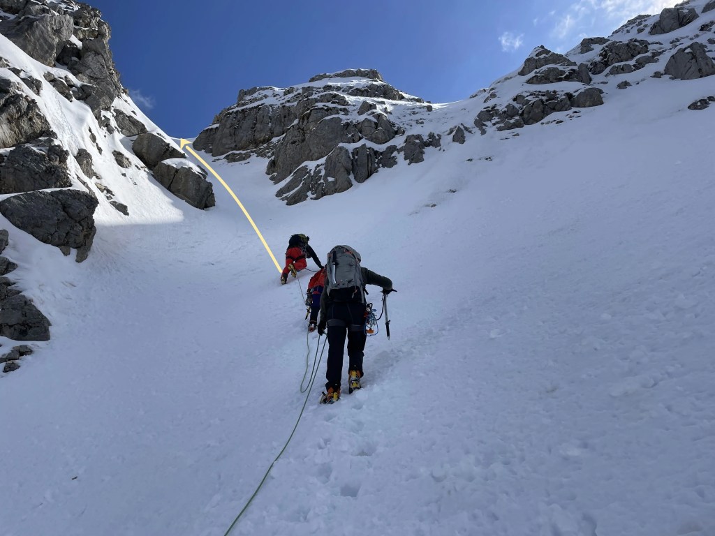 Από εκεί και πέρα, χαράξαμε μια πορεία με το σκεπτικό να παραμείνουμε στο ευνοϊκό χιόνι και να μην εκβιάσουμε μικτά, βράχινα περάσματα. Πράγματι, πίσω από χαρακτηριστικό βράχινο τείχος το κόψαμε πάλι αριστερά, μαιανδρικά κινούμενοι μέχρι την τελική ευθεία. Ως εκ τούτου, δεν κληθήκαμε να αντιμετωπίσαμε μικτά περάσματα Μ2, τα οποία αναφέρονται σε άλλες πηγές, αλλά κινηθήκαμε σε εξαιρετικά απότομο τμήμα 60°, στο πέρας της διαδρομής.