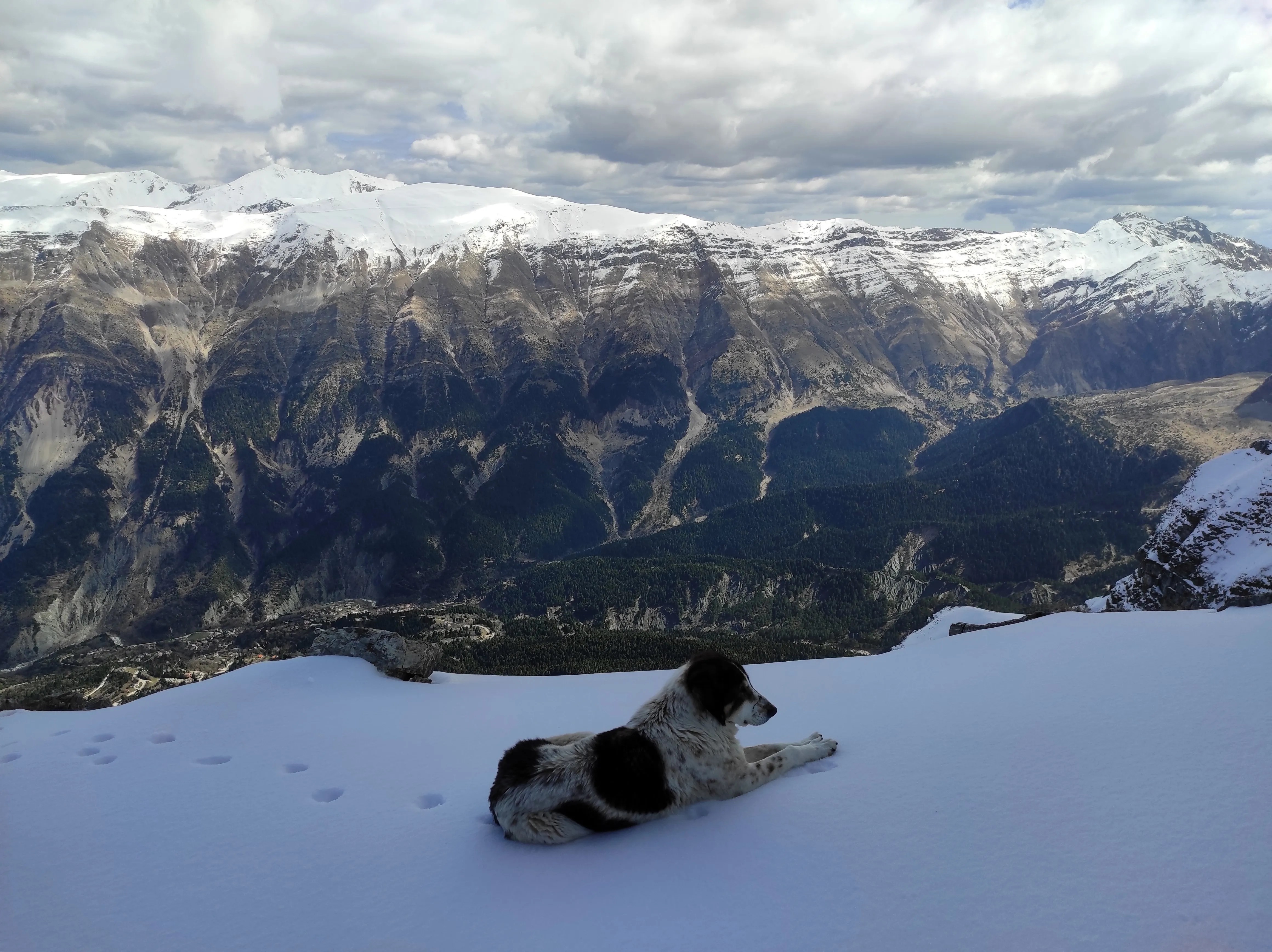 Νικημένοι από την απροθυμία να μπλέξουμε αχρείαστα σε μικτά -και να αραδιάσουμε τον σχετικό εξοπλισμό που, μέχρι τότε, κουβαλούσαμε για ομορφιά- όπως διανύαμε τα τελευταία μέτρα της πλαγιάς, στις μύτες των κραμπόν μας, ελπίζαμε να βγούμε στο επιθυμητό σημείο της κορυφογραμμής. Σήκωσα για πολλοστή φορά το βλέμμα, κοιτώντας με προσμονή το απώτατο σημείο της πλαγιάς. Και τότε, λες και είχα γίνει κοινωνός κάποιου obscure βουκολικού οράματος, αντίκρισα ένα κεφάλι σκύλου, να μας κοιτάζει με ένα τεράστιο ερωτηματικό καρτούν πάνω από το κεφάλι του. Ήταν η Χάσκι, το σκυλάκι του Καταφυγίου!