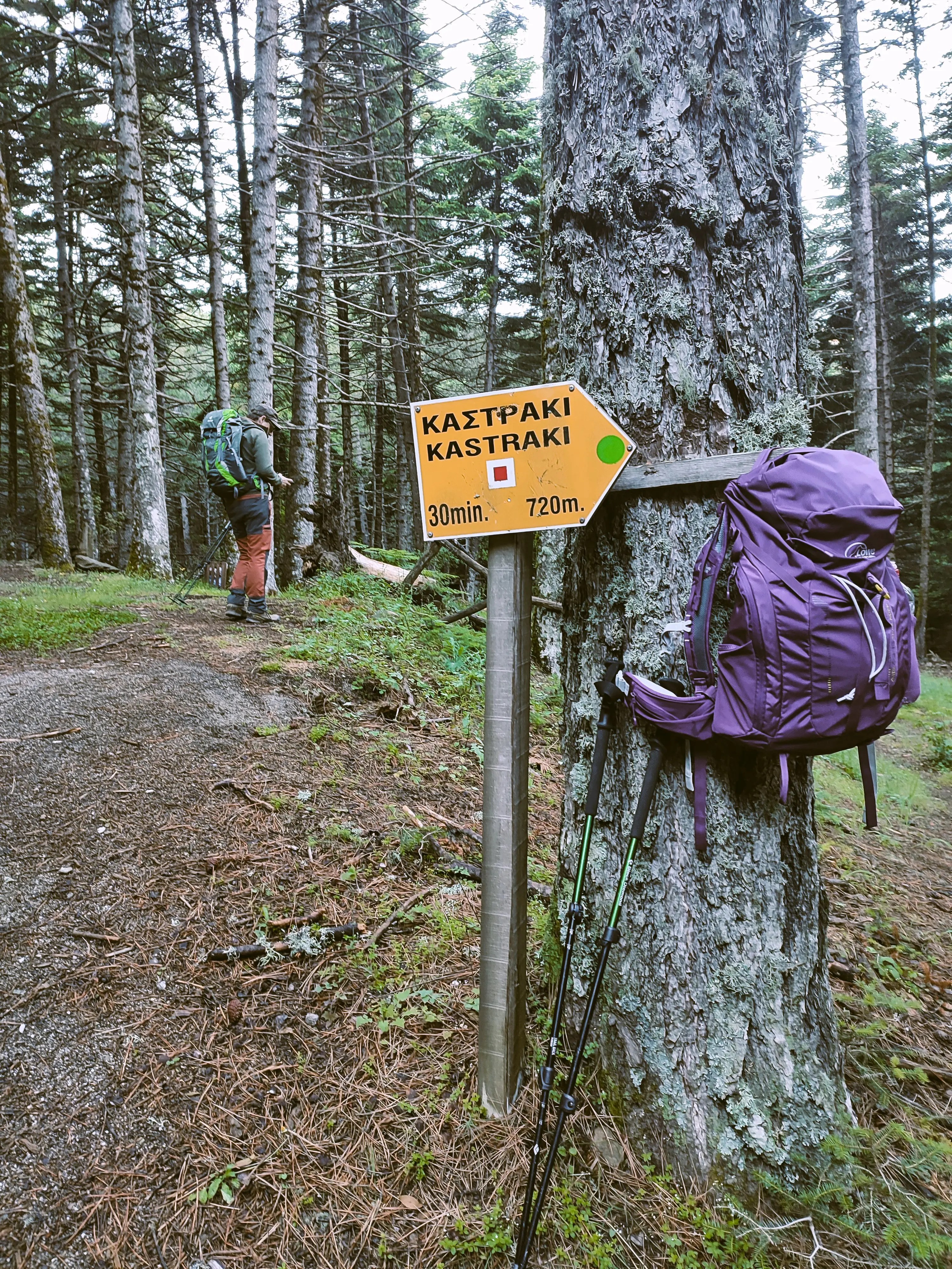 Κινούμαστε ολοένα και πιο ανατολικά. Έχουμε βάλει στόχο να βγούμε ψηλότερα, στον δασικό χωματόδρομο που έρχεται από τη Ζαρούχλα. Η σήμανση του μονοπατιού συνίσταται σε κόκκινα τρίγωνα μέσα σε άσπρο περίγραμμα και κρίνεται επαρκής, ως προς τη συχνότητα, αλλά και ως προς τη γραμμή της χάραξής της. Κάπως έτσι, αβίαστα, σαν μυρμήγκια στη φούχτα του σκιερού δάσους, κερδίζουμε κάτι λιγότερο από 300 μέτρα υψομετρικής ανάβασης και, γνωρίζοντας ότι έχουμε να ανέβουμε άλλα 900 , κοιτάμε το ρολόι μας και αισιοδοξούμε. Μόλις μία ώρα περπατάμε και σημειώνουμε πρόοδο… Ε, λοιπόν, μπορεί και να προλάβουμε μια παγωμένη μπίρα στην ταβέρνα, αργά το μεσημέρι! I dream on… Dream a little, I’ll dream on…