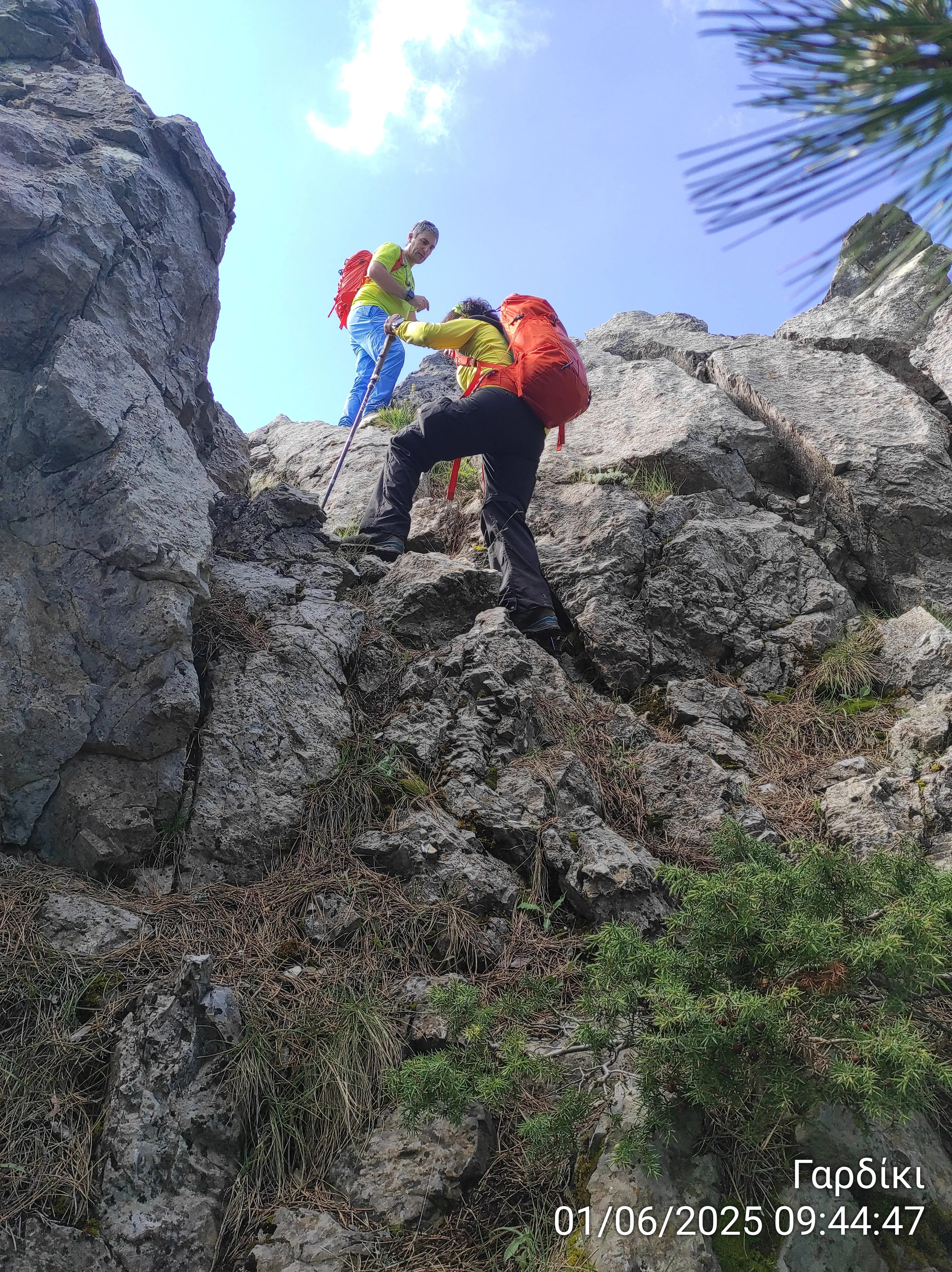 Για παράδειγμα, σε κάποιο σημείο -περίπου στα μισά της Διασέλας- ο γράφων προσπέρασε (όχι από σνομπισμό, αλλά από καθαρή αφηρημάδα) ηπιότερη λύση προσέγγισης στην κόψη, για να εξαναγκαστεί σε ένα κομματάκι δυσκολότερο scramble λίγα μέτρα πιο κάτω, με τους σοφούς συνορειβάτες μου να παρακολουθούν ξέγνοιαστα από την κόψη (βλέπε βίντεο). Παρεμπιπτόντως, για όλους τους παραπάνω λόγους, για την ασφάλεια της εν λόγω ανάβασης, θεωρώ επιβεβλημένη την ύπαρξη μιας συνοχικής ομάδας τη συλλογική κίνηση και συναπόφαση, χωρίς ατομικούς αυτοσχεδιασμούς και μεγάλες αποστάσεις. Στην περίπτωσή μας, η αδρεναλίνη και οι παλμοί ανέβηκαν μονάχα σε εκείνες τις (λίγες) περιπτώσεις που κάποιος πήρε το ρίσκο της εξατομικευμένης πορείας.