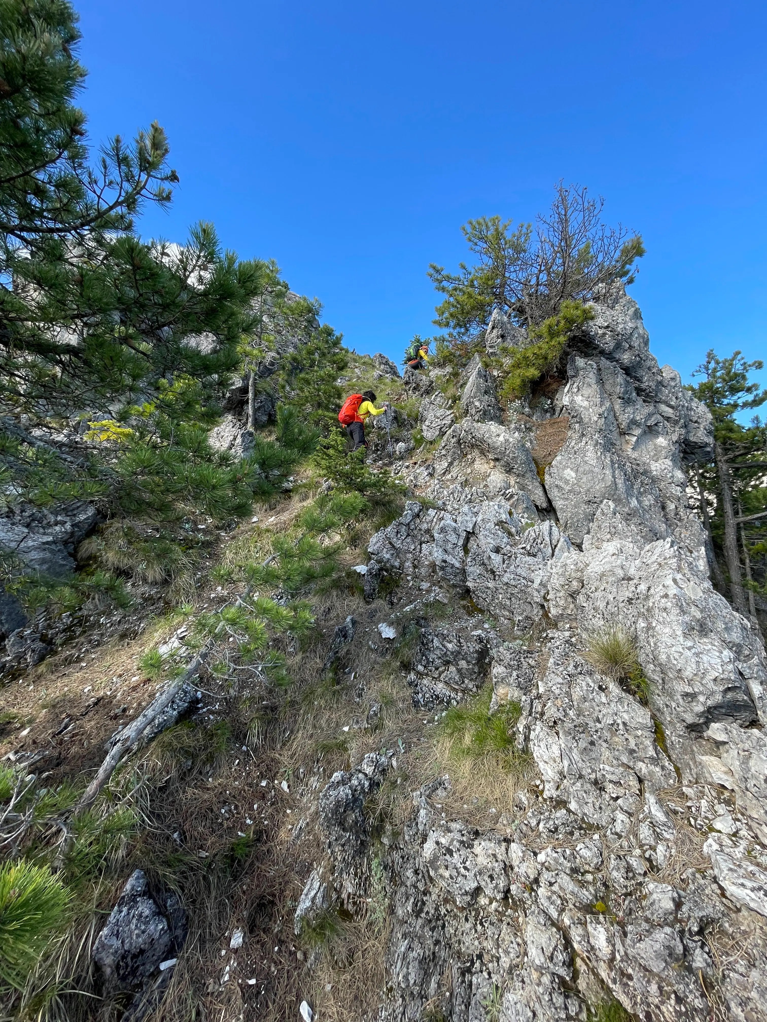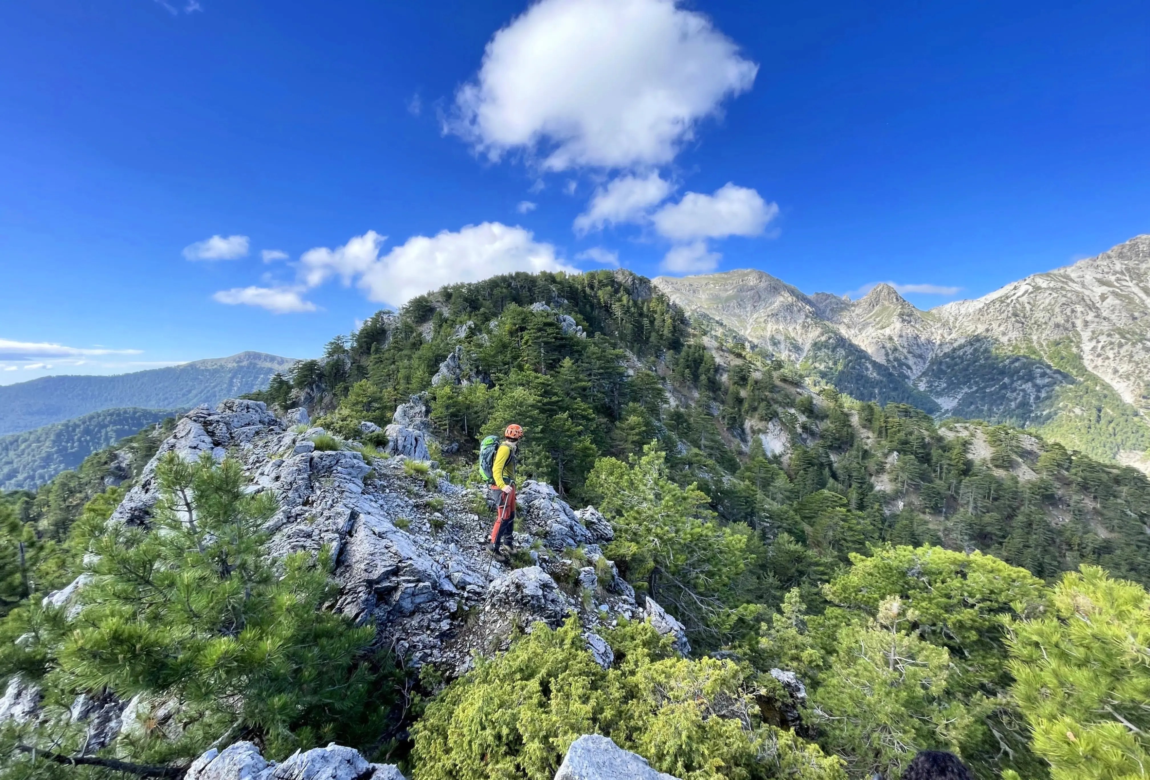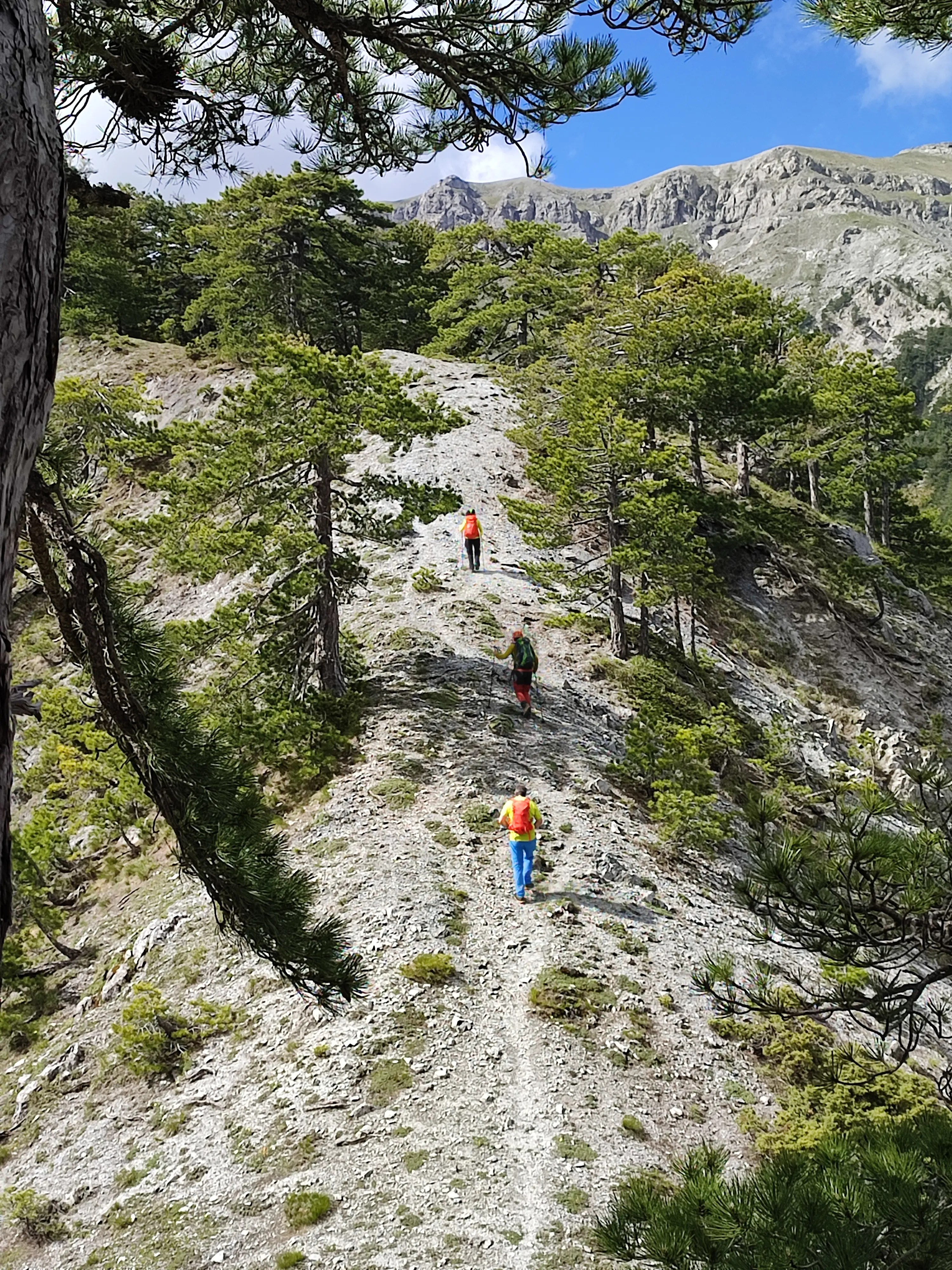Η κλίση ανεβαίνει, το τερέν αλλάζει, αγριεύει. Γίνεται πετρώδες, σαθρό… Υπό το βάρος των παπουτσιών μας, οι πέτρες από κάτω κυλάνε σαν γρανάζια σε κυλιόμενο ιμάντα, πάνω στον οποίο κινούμαστε σαν ανθρωπόμορφα χάμστερ. Το πλάτος τού αυχένα ολοένα και στενεύει, μέχρι που γίνεται κόψη. Στα δεξιά μας, δασωμένη πλαγιά 45 μοιρών που καταλήγει, 200 μέτρα χαμηλότερα, στο Λυκόρεμα. Στα αριστερά μας, απόκρημνα βράχια και, στη βάση τους, το ρέμα του Κρυνερίου. Περπατάμε στην κορυφή μιας πυραμίδας με παράπλευρες έδρες που καταλήγουν σε αβέβαιη μοίρα.