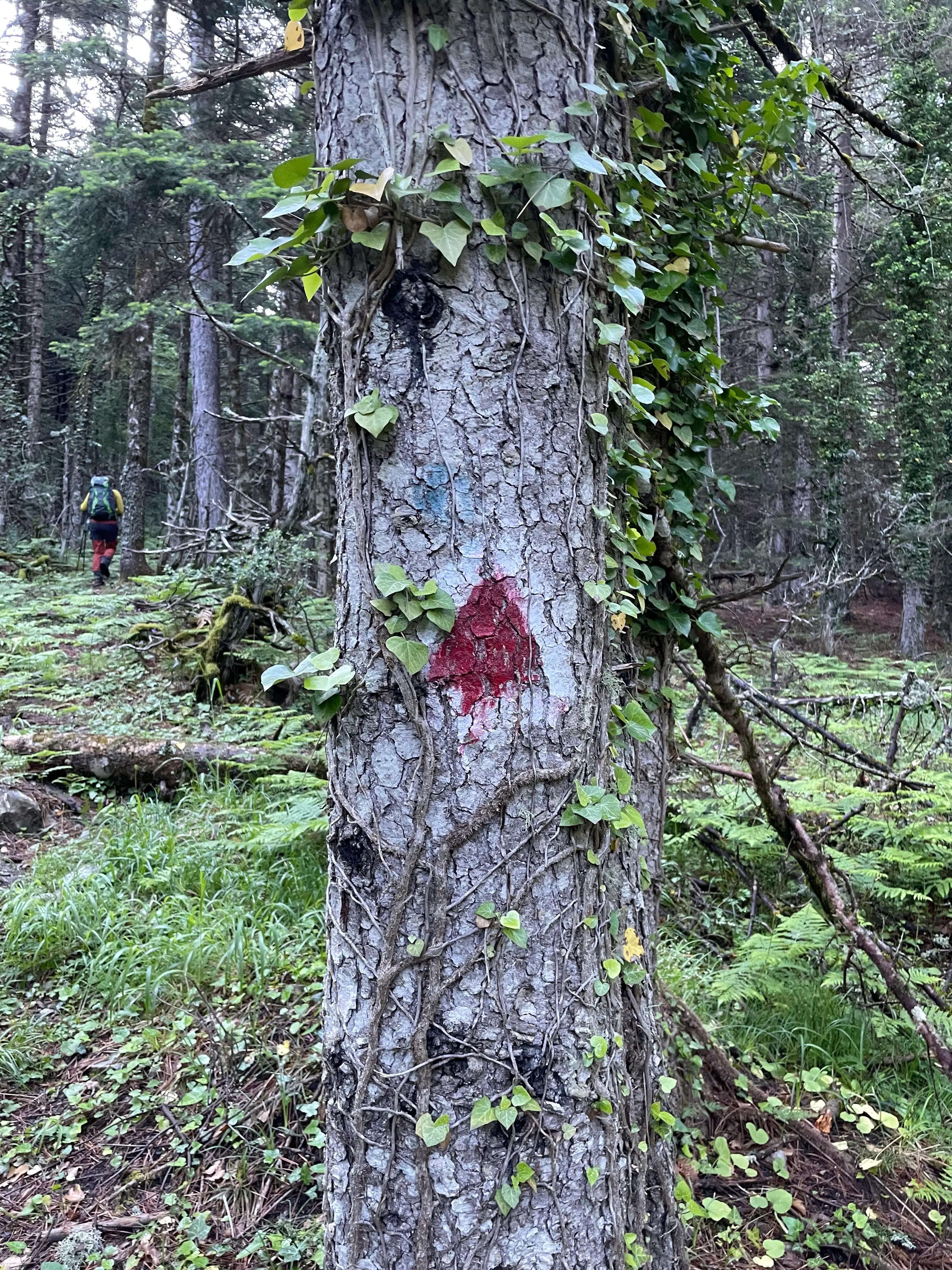 Περνώντας το κατώφλι της Διασέλας, ανηφορίζουμε σε ασαφές μονοπάτι και πλατύ, μαλακό, άκακο τερέν. Κοιτάμε δεξιά-αριστερά, λες και παρακολουθούμε Wimbledon, αναζητώντας κάποιου είδους σήμανση. Αραιά και που, εντοπίζουμε κάποιο πλαστικό ερυθρόλευκο κορδελάκι – ως μίνιμαλ ίχνος οιασδήποτε ανθρώπινης παρουσίας στην περιοχή.