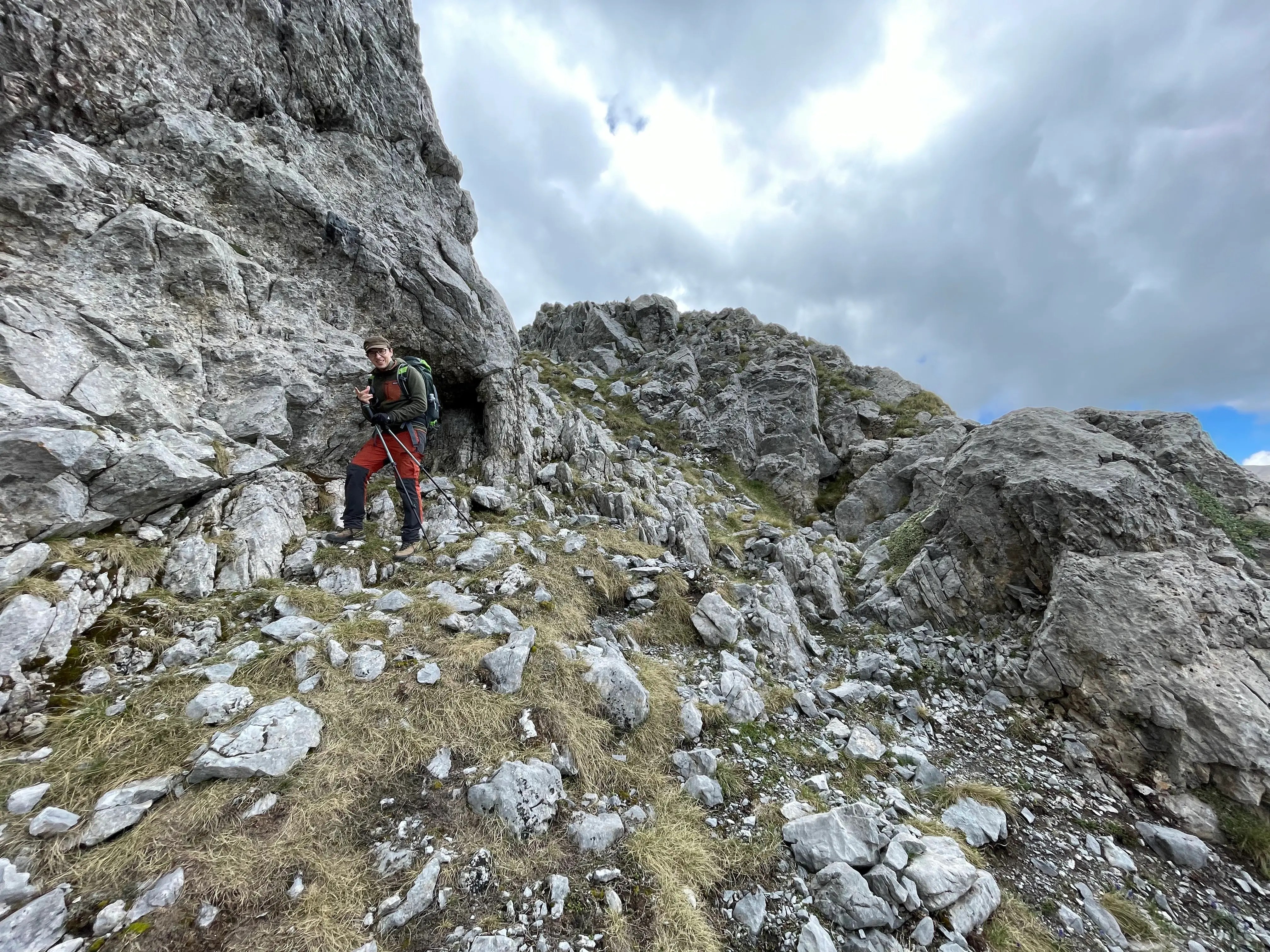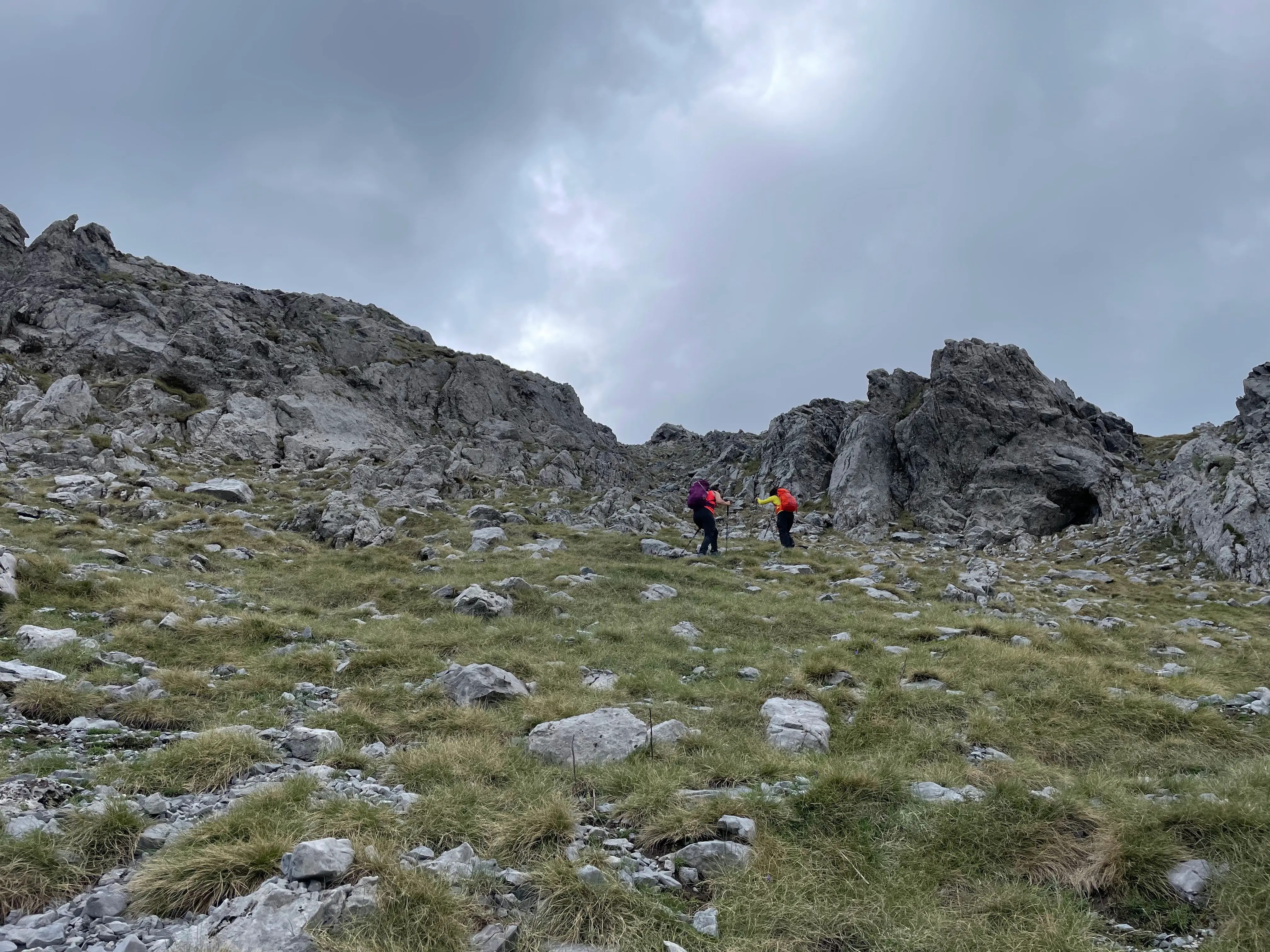 Αλαφροπατάμε σε μικρές σάρες και χαμηλή βλάστηση – τα σταθερά βράχια λίγα. Κόβουμε προς ανατολάς, μια και η direct προσέγγιση της κορυφής είναι σχεδόν αδύνατη. Ψηλότερα, ανάμεσα σε τείχη βράχων συναντάμε ένα σημείο που θυμίζει κατά τι «Πόρτες» Ταϋγέτου. Διορθώνουμε την πορεία μας και πάλι προς Νότο, μέχρι που καλύπτουμε την υψομετρική και βρισκόμαστε σε επίπεδες πλάκες – κάτι σαν προκορφή. Στο βάθος, ανάμεσα σε πράσινη, χαμηλή βλάστηση, ξεφυτρώνει το κολωνάκι της κορυφής.